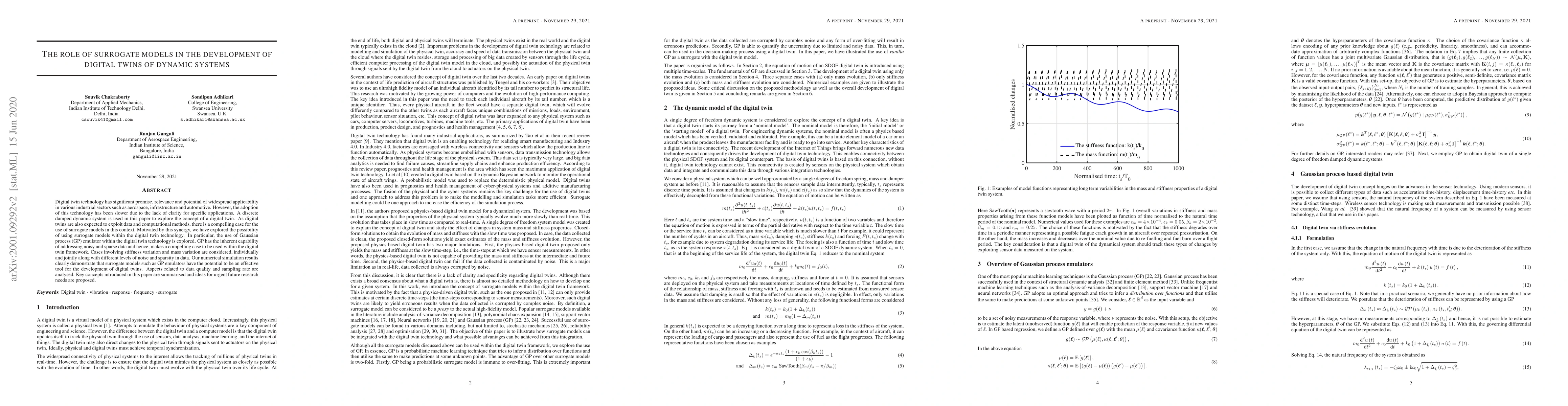 Digital twin technology has significant promise, relevance and potential of widespread applicability in various industrial sectors such as aerospace, infrastructure and automotive. However, the adoption of this technology has been slower due to the lack of clarity for specific applications. A discrete damped dynamic system is used in this paper to explore the concept of a digital twin. As digital twins are also expected to exploit data and computational methods, there is a compelling case for the use of surrogate models in this context. Motivated by this synergy, we have explored the possibility of using surrogate models within the digital twin technology. In particular, the use of Gaussian process (GP) emulator within the digital twin technology is explored. GP has the inherent capability of addressing noise and sparse data and hence, makes a compelling case to be used within the digital twin framework. Cases involving stiffness variation and mass variation are considered, individually and jointly along with different levels of noise and sparsity in data. Our numerical simulation results clearly demonstrate that surrogate models such as GP emulators have the potential to be an effective tool for the development of digital twins. Aspects related to data quality and sampling rate are analysed. Key concepts introduced in this paper are summarised and ideas for urgent future research needs are proposed.