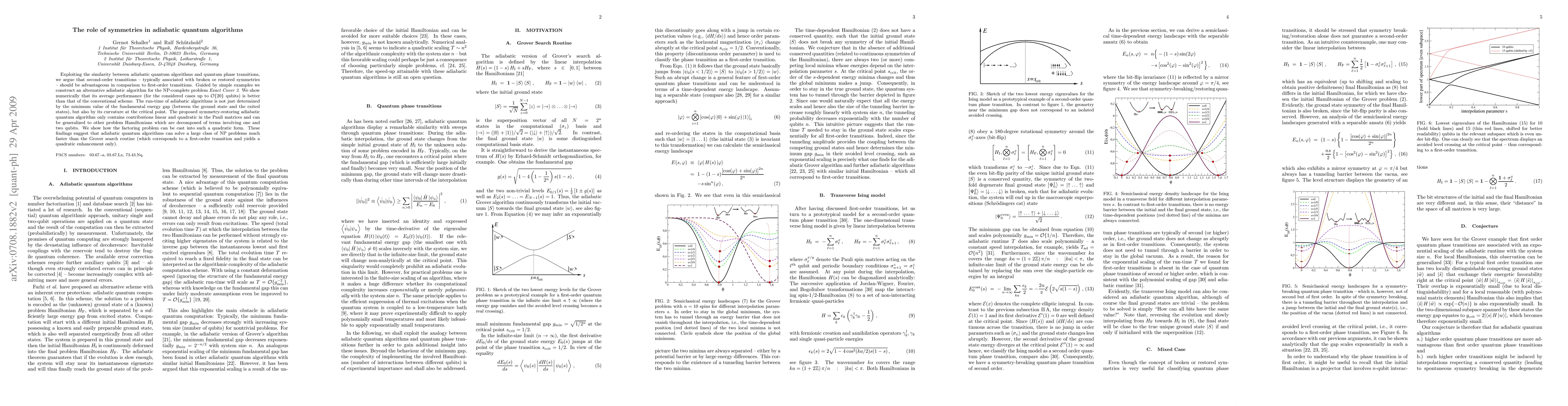 Exploiting the similarity between adiabatic quantum algorithms and quantum phase transitions, we argue that second-order transitions -- typically associated with broken or restored symmetries -- should be advantageous in comparison to first-order transitions. Guided by simple examples we construct an alternative adiabatic algorithm for the NP-complete problem {\em Exact Cover 3}. We show numerically that its average performance (for the considered cases up to ${\cal O}\{20\}$ qubits) is better than that of the conventional scheme. The run-time of adiabatic algorithms is not just determined by the minimum value of the fundamental energy gap (between the ground state and the exited states), but also by its curvature at the critical point. The proposed symmetry-restoring adiabatic quantum algorithm only contains contributions linear and quadratic in the Pauli matrices and can be generalized to other problem Hamiltonians which are decomposed of terms involving one and two qubits. We show how the factoring problem can be cast into such a quadratic form. These findings suggest that adiabatic quantum algorithms can solve a large class of NP problems much faster than the Grover search routine (which corresponds to a first-order transition and yields a quadratic enhancement only).