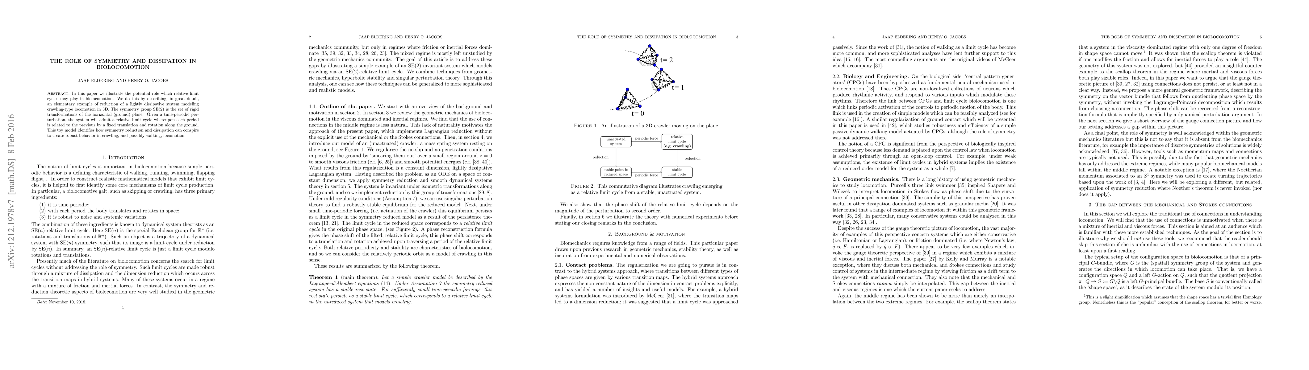 In this paper we illustrate the potential role which relative limit cycles may play in biolocomotion. We do this by describing, in great detail, an elementary example of reduction of a lightly dissipative system modeling crawling-type locomotion in 3D. The symmetry group SE(2) is the set of rigid transformations of the horizontal (ground) plane. Given a time-periodic perturbation, the system will admit a relative limit cycle whereupon each period is related to the previous by a fixed translation and rotation along the ground. This toy model identifies how symmetry reduction and dissipation can conspire to create robust behavior in crawling, and possibly walking, locomotion.