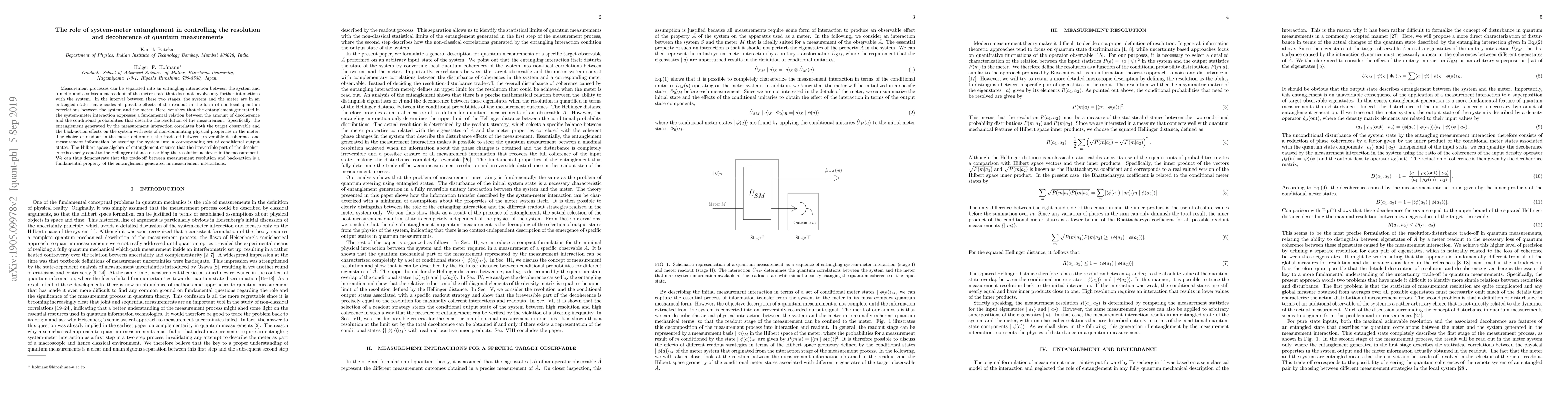 This paper explores how system-meter entanglement influences the resolution and decoherence in quantum measurements. It reveals that the entanglement generated during the measurement process determines the balance between measurement resolution and decoherence, with the Hilbert space algebra ensuring that the irreversible decoherence equals the resolution's Hellinger distance.