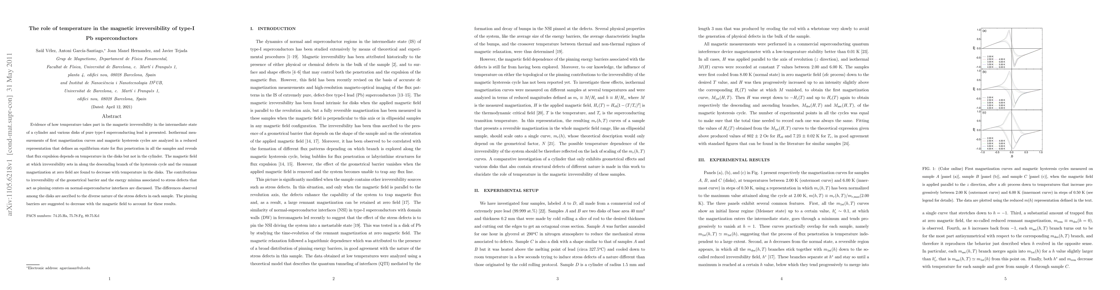 This study investigates how temperature affects magnetic irreversibility in type-I lead superconductors, finding that flux expulsion depends on temperature in disks but not in cylinders. Temperature decreases the remnant magnetization at zero field and pinning barriers.