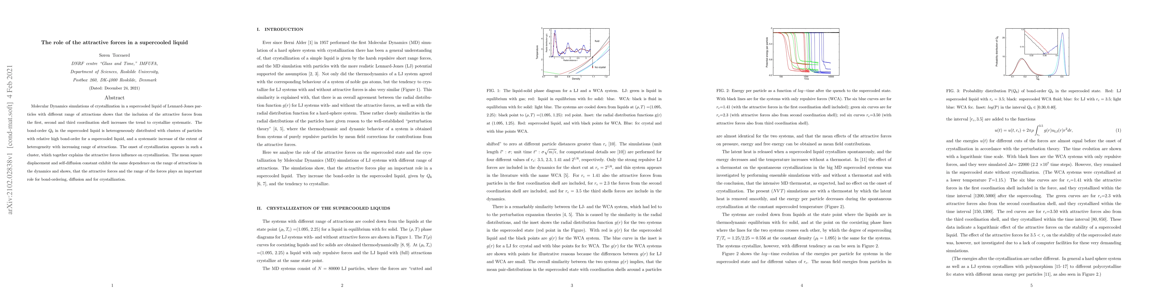 Molecular Dynamics simulations of crystallization in a supercooled liquid of Lennard-Jones particles with different range of attractions shows that the inclusion of the attractive forces from the first, second and third coordination shell increases the trend to crystallize systematic. The bond-order $Q_6$ in the supercooled liquid is heterogeneously distributed with clusters of particles with relative high bond-order for a supercooled liquid, and a systematic increase of the extent of heterogeneity with increasing range of attractions. The onset of crystallization appears in such a cluster, which together explains the attractive forces influence on crystallization. The mean square displacement and self-diffusion constant exhibit the same dependence on the range of attractions in the dynamics and shows, that the attractive forces and the range of the forces plays an important role for bond-ordering, diffusion and for crystallization.