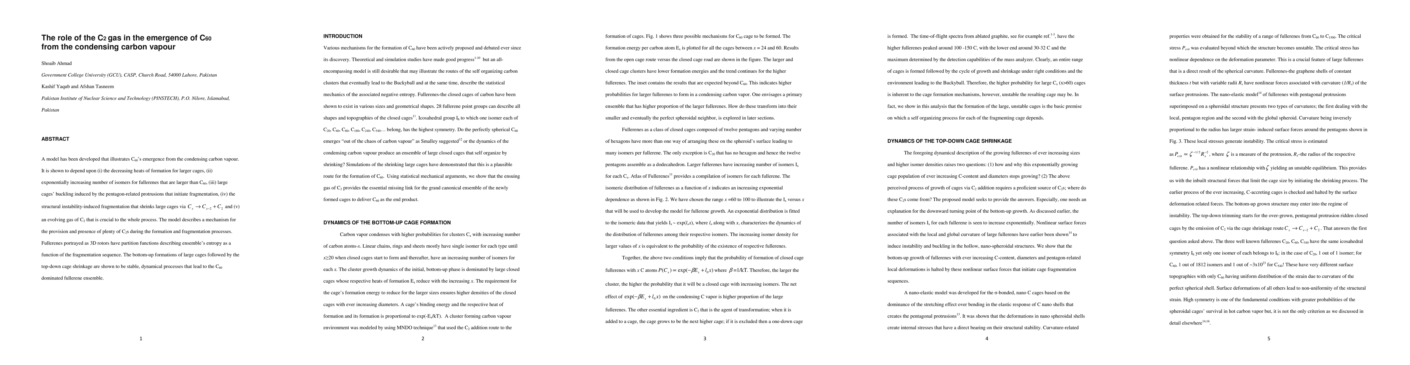 This paper develops a model explaining the formation of C60 from condensing carbon vapor, emphasizing the crucial role of C2 gas. The model highlights the interplay between structural instability, fragmentation, and the presence of C2 gas, leading to the emergence of C60 through stable, dynamic processes.