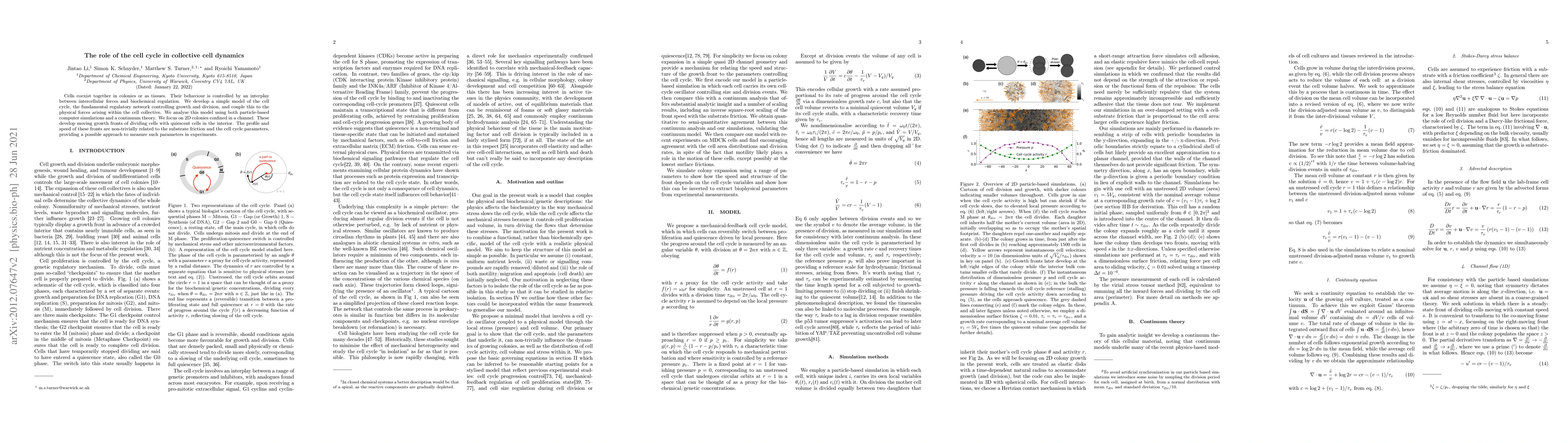 Cells coexist together in colonies or as tissues. Their behaviour is controlled by an interplay between intercellular forces and biochemical regulation. We develop a simple model of the cell cycle, the fundamental regulatory network controlling growth and division, and couple this to the physical forces arising within the cell collective. We analyse this model using both particle-based computer simulations and a continuum theory. We focus on 2D colonies confined in a channel. These develop moving growth fronts of dividing cells with quiescent cells in the interior. The profile and speed of these fronts are non-trivially related to the substrate friction and the cell cycle parameters, providing a possible approach to measure such parameters in experiments.