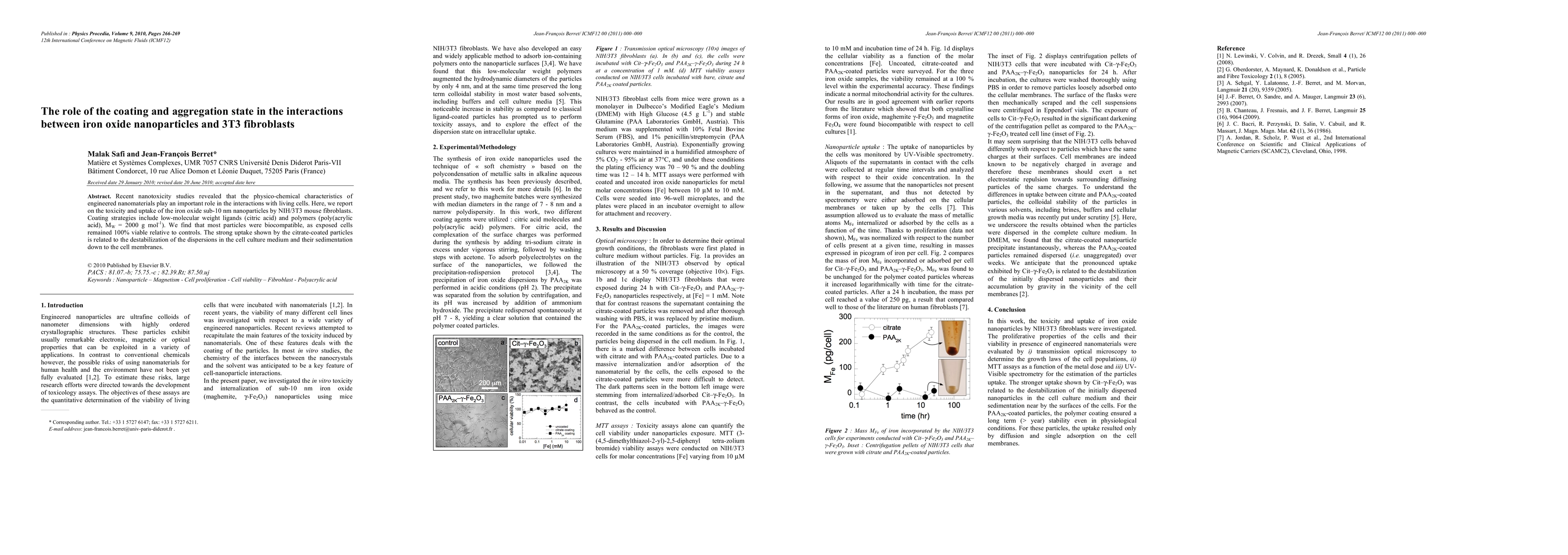 This study investigates the toxicity and cellular uptake of sub-10 nm iron oxide nanoparticles by NIH/3T3 fibroblasts, finding that citrate-coated particles are more readily taken up due to dispersion destabilization and sedimentation, while other coatings maintain cell viability.