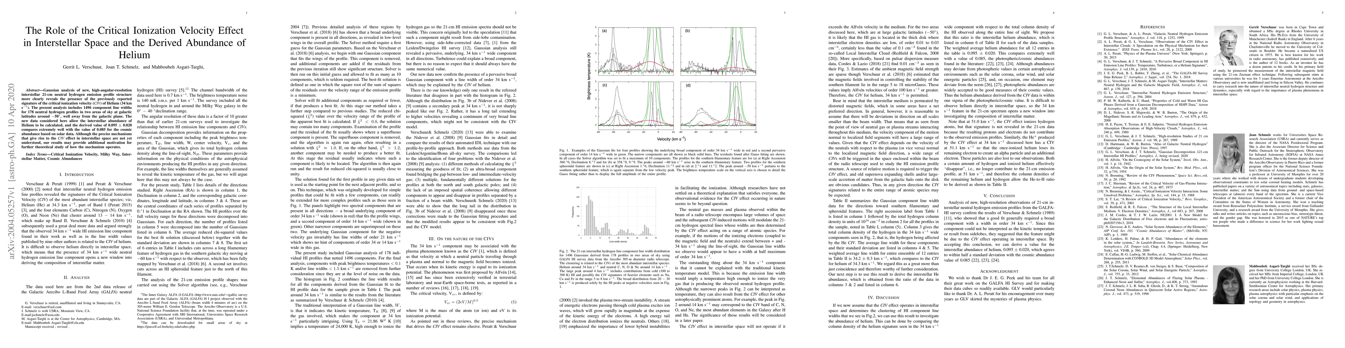 Gaussian analysis of new, high-angular-resolution interstellar 21-cm neutral hydrogen emission profile structure more clearly reveals the presence of the previously reported signature of the critical ionization velocity ({\it CIV}) of Helium (34 km s$^{-1}$). The present analysis includes 1496 component line widths for 178 neutral hydrogen profiles in two areas of sky at galactic latitudes around $-$50$^\circ$, well away from the galactic plane. The new data considered here allow the interstellar abundance of Helium to be calculated, and the derived value of 0.095 $\pm$ 0.020 compares extremely well with the value of 0.085 for the cosmic abundance based on solar data. Although the precise mechanisms that give rise to the {\it CIV} effect in interstellar space are not yet understood, our results may provide additional motivation for further theoretical study of how the mechanism operates.