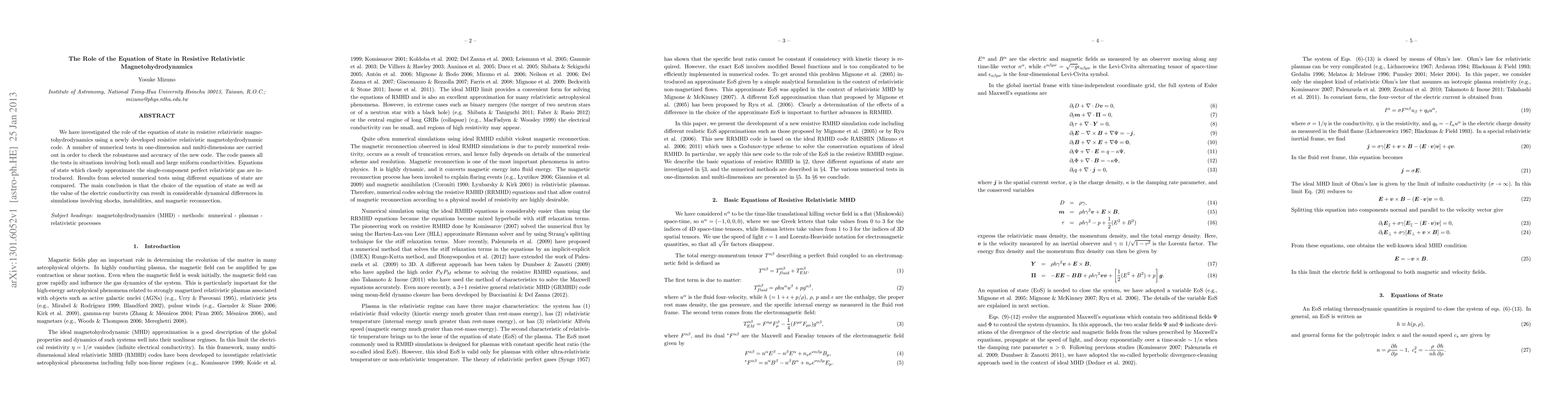 This paper investigates how different equations of state affect resistive relativistic magnetohydrodynamics using a newly developed code. The study finds that variations in the equation of state and electric conductivity can lead to significant differences in simulations of shocks, instabilities, and magnetic reconnection.