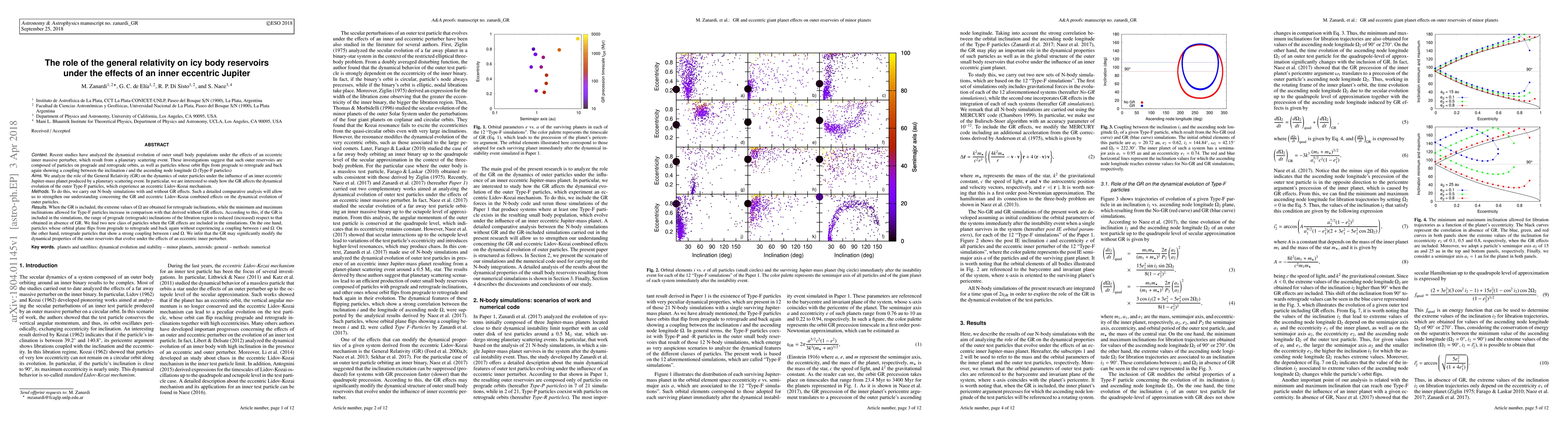 Recent studies have analyzed the dynamical evolution of outer small body populations under the effects of an eccentric inner massive perturber. Such outer reservoirs are composed of particles on prograde and retrograde orbits, as well as particles whose orbit flips from prograde to retrograde and back again showing a coupling between the inclination i and the ascending node longitude \Omega (Type-F particles). We analyze the role of the General Relativity (GR) on the dynamics of outer particles under the influence of an inner eccentric Jupiter-mass planet produced by a planetary scattering event. In particular, we study how the GR affects the dynamical evolution of the outer Type-F particles, which experience an eccentric Lidov-Kozai mechanism. We carry out N-body simulations with and without GR effects. When the GR is included, the extreme values of \Omega are obtained for retrograde inclinations, while the minimum and maximum inclinations allowed for Type-F particles increase in comparison with that derived without GR effects. According to this, if the GR is included in the simulations, the range of prograde (retrograde) inclinations of the libration region is reduced (increased) respect to that obtained in absence of GR. We find two new class of particles when the GR effects are included in the simulations. On the one hand, particles whose orbital plane flips from prograde to retrograde and back again without experiencing a coupling between i and \Omega. On the other hand, retrograde particles that show a strong coupling between i and \Omega. We infer that the GR may significantly modify the dynamical properties of the outer reservoirs that evolve under the effects of an eccentric inner perturber.