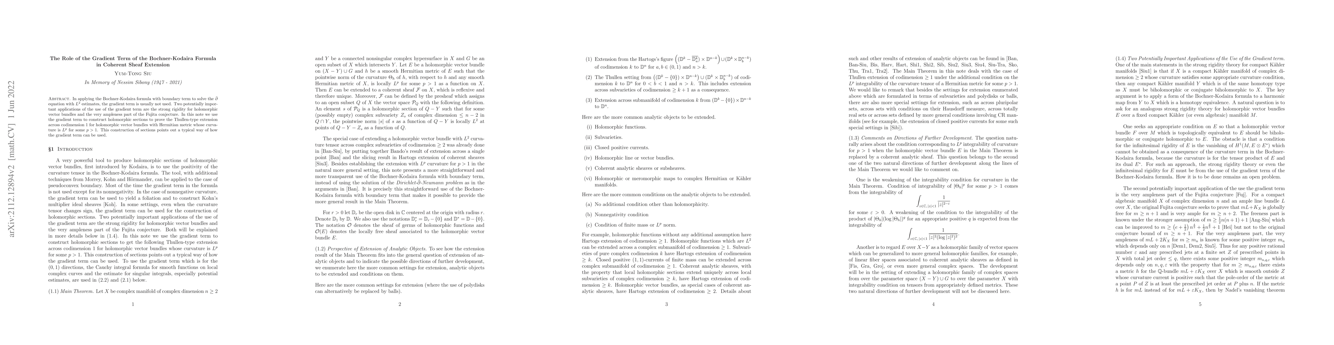 In applying the Bochner-Kodaira formula with boundary term to solve the $\bar\partial$ equation with $L^2$ estimates, the gradient term is usually not used. Two potentially important applications of the use of the gradient term are the strong rigidity for holomorphic vector bundles and the very ampleness part of the Fujita conjecture. In this note we use the gradient term to construct holomorphic sections to prove the Thullen-type extension across codimension $1$ for holomorphic vector bundles with Hermitian metric whose curvature is $L^p$ for some $p>1$. This construction of sections points out a typical way of how the gradient term can be used.