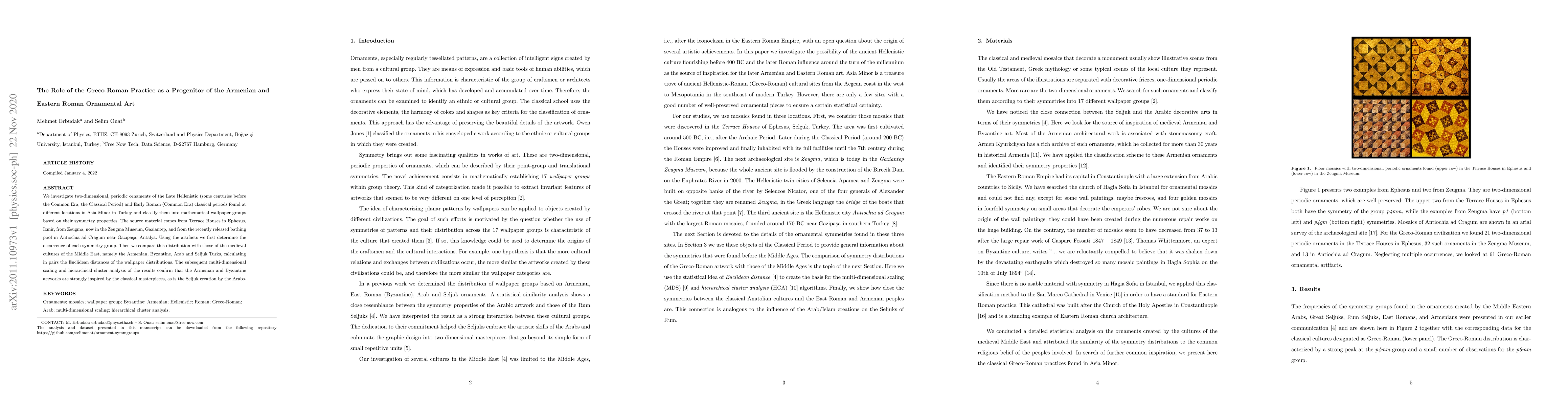 We investigate two-dimensional, periodic ornaments of the Late Hellenistic (some centuries before the Common Era, the Classical Period) and Early Roman (Common Era) classical periods found at different locations in Asia Minor in Turkey and classify them into mathematical wallpaper groups based on their symmetry properties. The source material comes from Terrace Houses in Ephesus, Izmir, from Zeugma, now in the Zeugma Museum, Gaziantep, and from the recently released bathing pool in Antiochia ad Cragum near Gazipa\c{s}a, Antalya. Using the artifacts we first determine the occurrence of each symmetry group. Then we compare this distribution with those of the medieval cultures of the Middle East, namely the Armenian, Byzantine, Arab and Seljuk Turks, calculating in pairs the Euclidean distances of the wallpaper distributions. The subsequent multi-dimensional scaling and hierarchical cluster analysis of the results confirm that the Armenian and Byzantine artworks are strongly inspired by the classical masterpieces, as is the Seljuk creation by the Arabs.