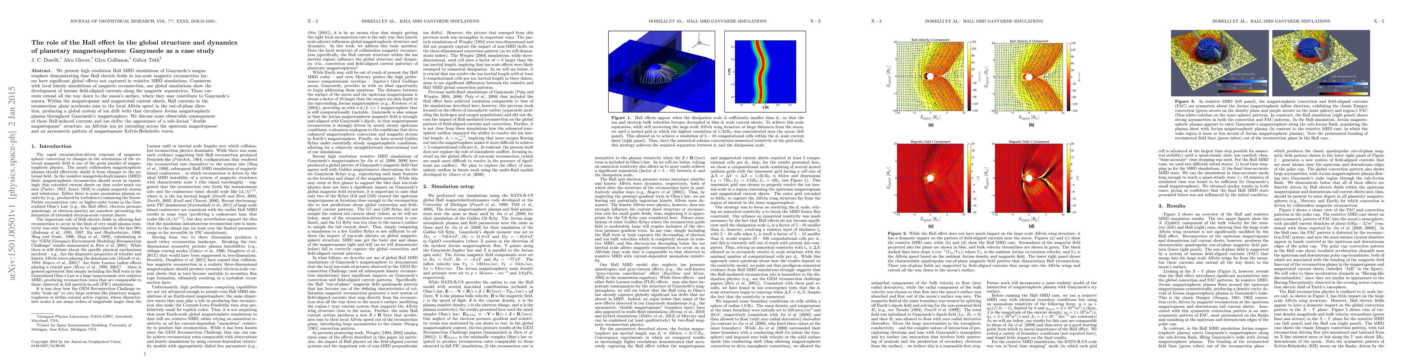 We present high resolution Hall MHD simulations of Ganymede's magnetosphere demonstrating that Hall electric fields in ion-scale magnetic reconnection layers have significant global effects not captured in resistive MHD simulations. Consistent with local kinetic simulations of magnetic reconnection, our global simulations show the development of intense field-aligned currents along the magnetic separatrices. These currents extend all the way down to the moon's surface, where they may contribute to Ganymede's aurora. Within the magnetopause and magnetotail current sheets, Hall currents in the reconnection plane accelerate ions to the local Alfv\'en speed in the out-of-plane direction, producing a global system of ion drift belts that circulates Jovian magnetospheric plasma throughout Ganymede's magnetosphere. We discuss some observable consequences of these Hall-induced currents and ion drifts: the appearance of a sub-Jovian "double magnetopause" structure, an Alfv\'enic ion jet extending across the upstream magnetopause and an asymmetric pattern of magnetopause Kelvin-Helmholtz waves.