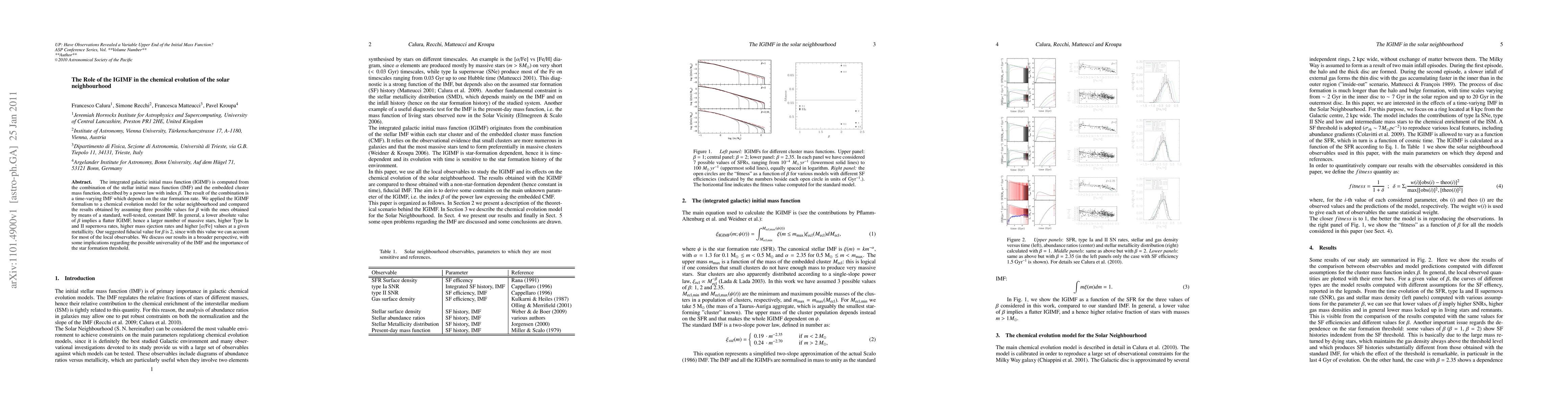 This paper explores the integrated galactic initial mass function (IGIMF) in the context of the solar neighbourhood's chemical evolution, comparing it to a standard constant IMF. A lower absolute value of beta in the IGIMF leads to more massive stars, higher supernova rates, and higher [alpha/Fe] values, suggesting a fiducial value of beta as 2 for better alignment with local observations.