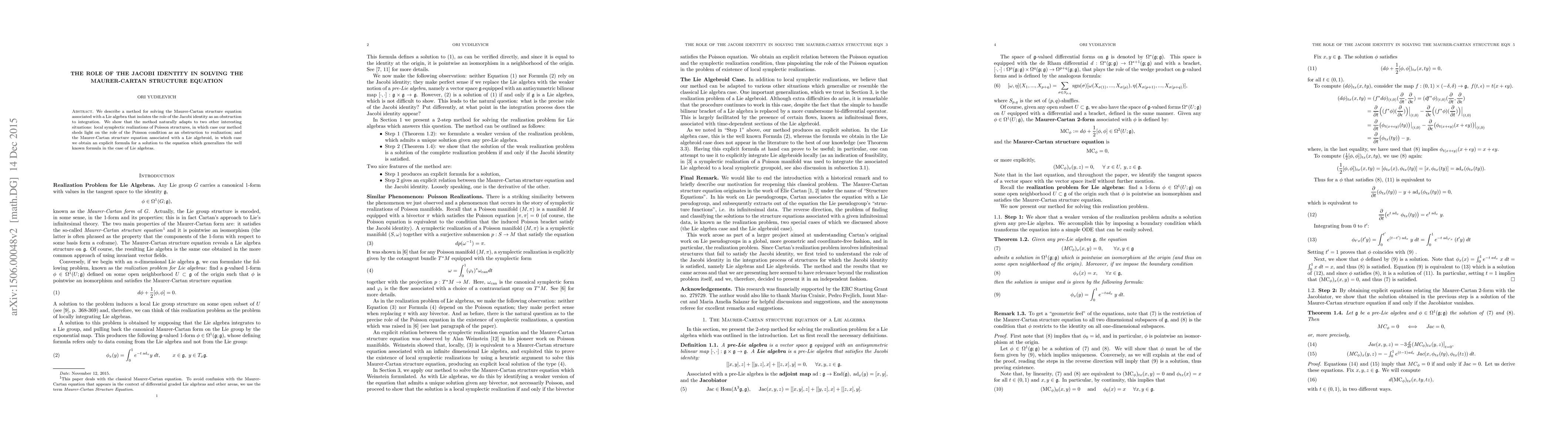 We describe a method for solving the Maurer-Cartan structure equation associated with a Lie algebra that isolates the role of the Jacobi identity as an obstruction to integration. We show that the method naturally adapts to two other interesting situations: local symplectic realizations of Poisson structures, in which case our method sheds light on the role of the Poisson condition as an obstruction to realization; and the Maurer-Cartan structure equation associated with a Lie algebroid, in which case we obtain an explicit formula for a solution to the equation which generalizes the well known formula in the case of Lie algebras.