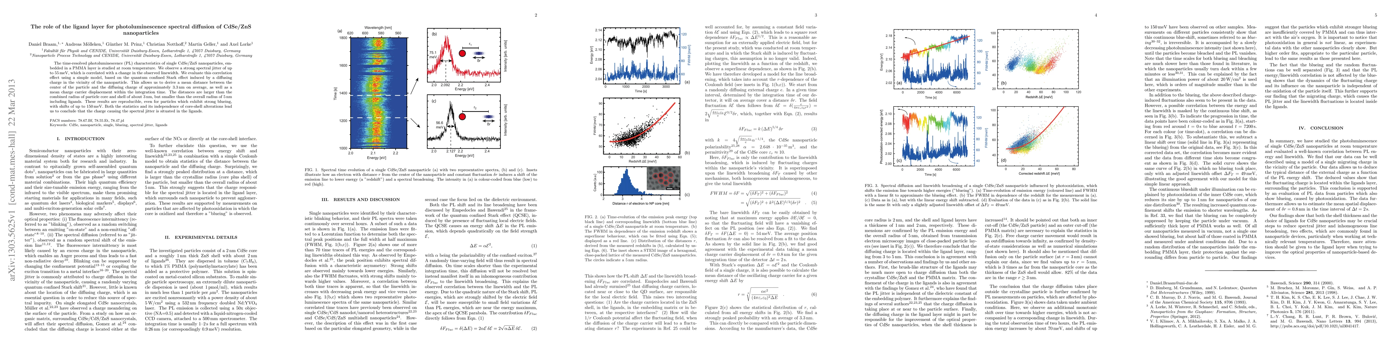 The time-resolved photoluminescence (PL) characteristics of single CdSe/ZnS nanoparticles, embedded in a PMMA layer is studied at room temperature. We observe a strong spectral jitter of up to 55 meV, which is correlated with a change in the observed linewidth. We evaluate this correlation effect using a simple model, based on the quantum confined Stark effect induced by a diffusing charge in the vicinity of the nanoparticle. This allows us to derive a mean distance between the center of the particle and the diffusing charge of approximately 3.3 nm on average, as well as a mean charge carrier displacement within the integration time. The distances are larger than the combined radius of particle core and shell of about 3 nm, but smaller than the overall radius of 5 nm including ligands. These results are reproducible, even for particles which exhibit strong blueing, with shifts of up to 150 meV. Both the statistics and its independence of core-shell alterations lead us to conclude that the charge causing the spectral jitter is situated in the ligands.