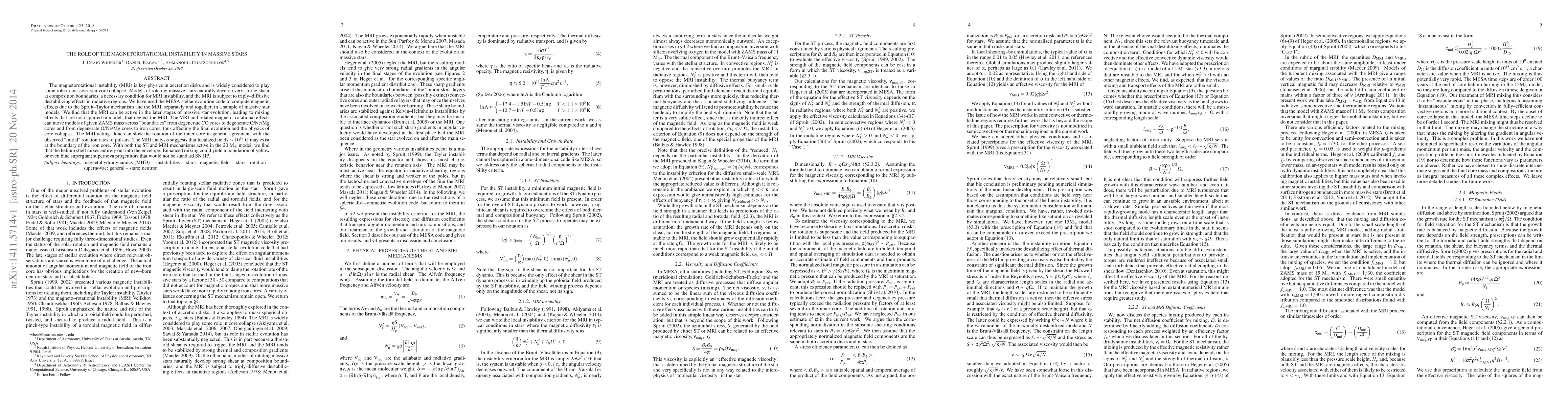 The magnetorotational instability (MRI) is key physics in accretion disks and is widely considered to play some role in massive-star core collapse. Models of rotating massive stars naturally develop very strong shear at composition boundaries, a necessary condition for MRI instability, and the MRI is subject to triply-diffusive destabilizing effects in radiative regions. We have used the MESA stellar evolution code to compute magnetic effects due to the Spruit-Taylor mechanism and the MRI, separately and together, in a sample of massive star models. We find that the MRI can be active in the later stages of massive star evolution, leading to mixing effects that are not captured in models that neglect the MRI. The MRI and related magneto-rotational effects can move models of given ZAMS mass across "boundaries" from degenerate CO cores to degenerate O/Ne/Mg cores and from degenerate O/Ne/Mg cores to iron cores, thus affecting the final evolution and the physics of core collapse. The MRI acting alone can slow the rotation of the inner core in general agreement with the observed "initial" rotation rates of pulsars. The MRI analysis suggests that localized fields ~10^{12} G may exist at the boundary of the iron core. With both the ST and MRI mechanisms active in the 20 solar mass model, we find that the helium shell mixes entirely out into the envelope. Enhanced mixing could yield a population of yellow or even blue supergiant supernova progenitors that would not be standard SN IIP.