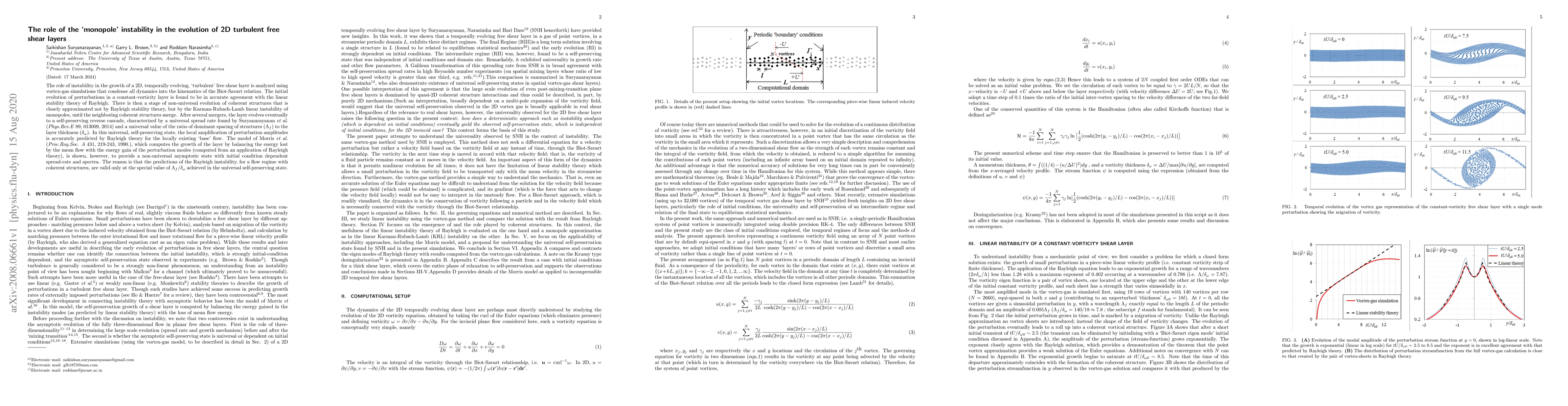 The role of instability in the growth of a 2D, temporally evolving, `turbulent' free shear layer is analyzed using vortex-gas simulations that condense all dynamics into the kinematics of the Biot-Savart relation. The initial evolution of perturbations in a constant-vorticity layer is found to be in accurate agreement with the linear stability theory of Rayleigh. There is then a stage of non-universal evolution of coherent structures that is closely approximated not by Rayleigh stability theory, but by the Karman-Rubach-Lamb linear instability of monopoles, until the neighboring coherent structures merge. After several mergers, the layer evolves eventually to a self-preserving reverse cascade, characterized by a universal spread rate found by Suryanarayanan et al. (Phys.Rev.E 89, 013009, 2014) and a universal value of the ratio of dominant spacing of structures ($\Lambda_f$) to the layer thickness ($\delta_\omega$). In this universal, self-preserving state, the local amplification of perturbation amplitudes is accurately predicted by Rayleigh theory for the locally existing `base' flow. The model of Morris et al. (Proc.Roy.Soc. A 431, 219-243, 1990.), which computes the growth of the layer by balancing the energy lost by the mean flow with the energy gain of the perturbation modes (computed from an application of Rayleigh theory), is shown, however, to provide a non-universal asymptotic state with initial condition dependent spread-rate and spectra. The reason is that the predictions of the Rayleigh instability, for a flow regime with coherent structures, are valid only at the special value of $\Lambda_f/\delta_\omega$ achieved in the universal self-preserving state.