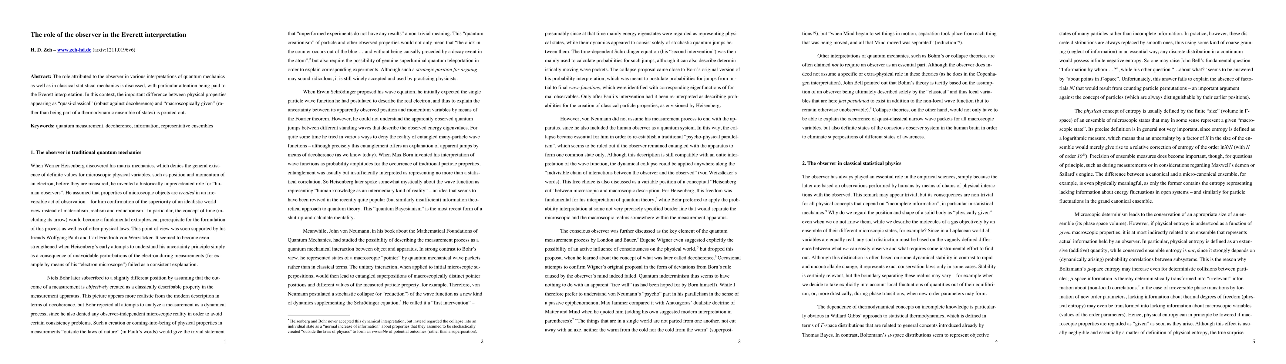 This paper examines the observer's role in the Everett interpretation of quantum mechanics, distinguishing between quasi-classical and macroscopically given states, and highlights how these concepts differ from classical statistical mechanics.