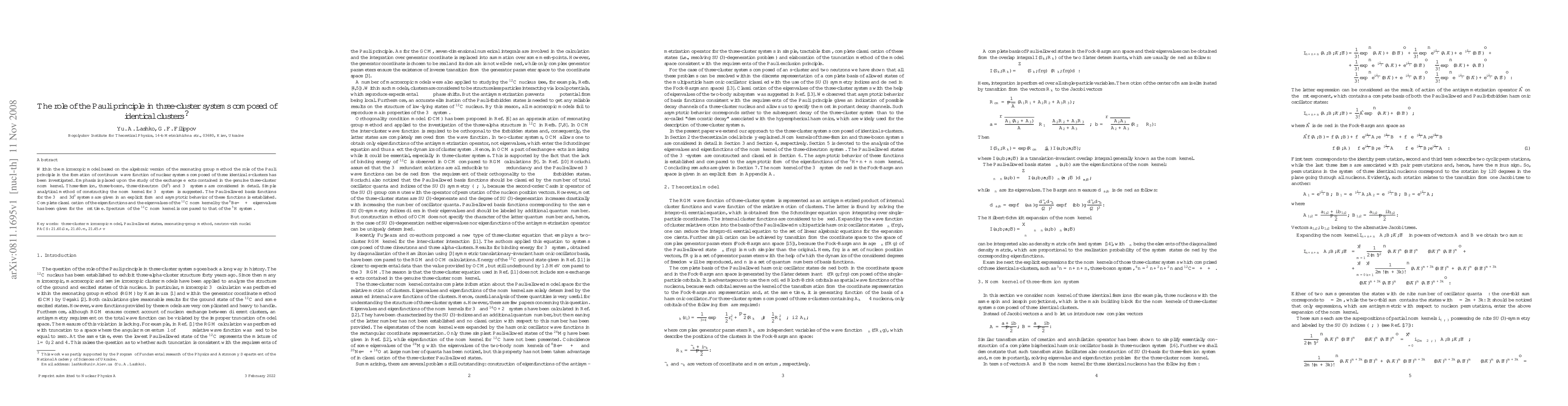 Within the microscopic model based on the algebraic version of the resonating group method the role of the Pauli principle in the formation of continuum wave function of nuclear systems composed of three identical $s$-clusters has been investigated. Emphasis is placed upon the study of the exchange effects contained in the genuine three-cluster norm kernel. Three-fermion, three-boson, three-dineutron ($3d'$) and $3\alpha$ systems are considered in detail. Simple analytical method of constructing the norm kernel for $3\alpha$ system is suggested. The Pauli-allowed basis functions for the $3\alpha$ and $3d'$ systems are given in an explicit form and asymptotic behavior of these functions is established. Complete classification of the eigenfunctions and the eigenvalues of the $^{12}$C norm kernel by the $^8$Be$=\alpha+\alpha$ eigenvalues has been given for the first time. Spectrum of the $^{12}$C norm kernel is compared to that of the $^{5}$H system.