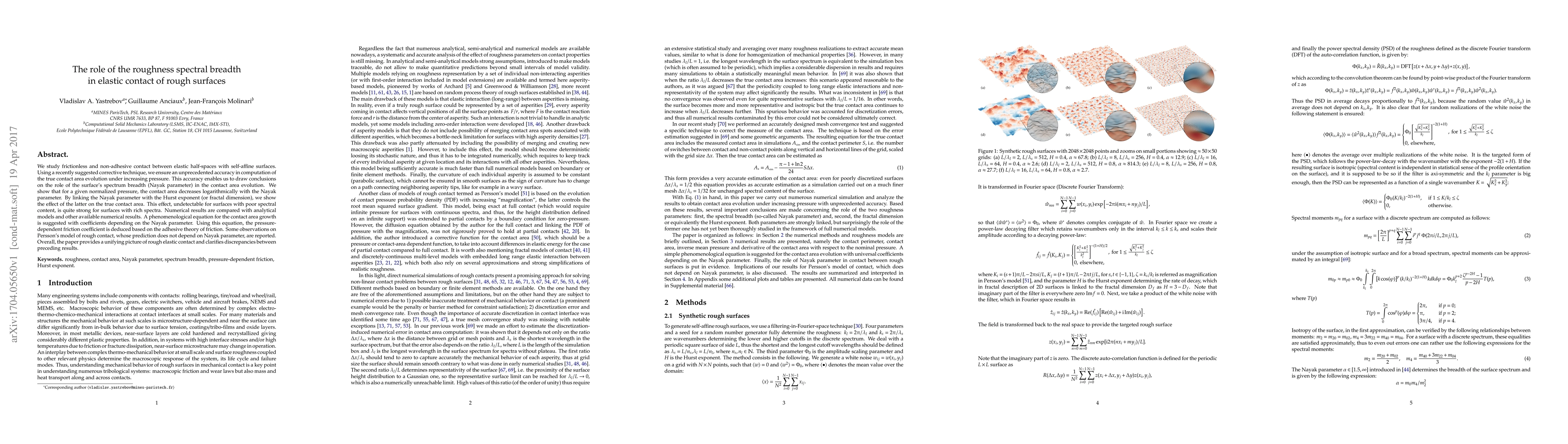 Researchers study frictionless contact between elastic surfaces with varying roughness spectral breadth, finding that it decreases logarithmically with the Nayak parameter, which affects true contact area evolution.
