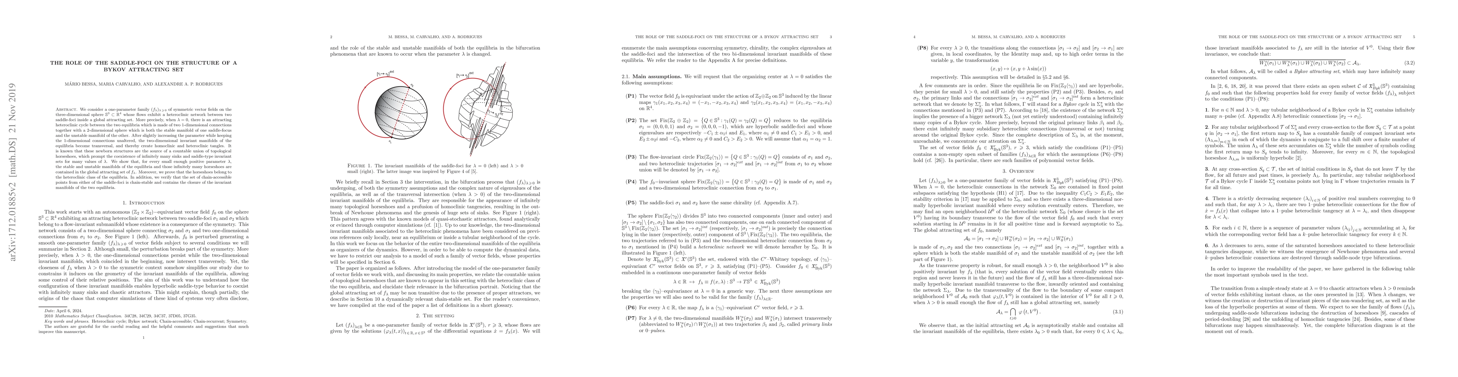 We consider a one-parameter family $(f_\lambda)_{\lambda \, \geqslant \, 0}$ of symmetric vector fields on the three-dimensional sphere $\mathbb{S}^3\subset\mathbb{R}^4$ whose flows exhibit a heteroclinic network between two saddle-foci inside a global attracting set. More precisely, when $\lambda = 0$, there is an attracting heteroclinic cycle between the two equilibria which is made of two $1$-dimensional connections together with a $2$-dimensional sphere which is both the stable manifold of one saddle-focus and the unstable manifold of the other. After slightly increasing the parameter while keeping the $1$-dimensional connections unaltered, the two-dimensional invariant manifolds of the equilibria become transversal, and thereby create homoclinic and heteroclinic tangles. It is known that these newborn structures are the source of a countable union of topological horseshoes, which prompt the coexistence of infinitely many sinks and saddle-type invariant sets for many values of $\lambda$. We show that, for every small enough positive parameter $\lambda$, the stable and unstable manifolds of the equilibria and those infinitely many horseshoes are contained in the global attracting set of $f_\lambda$. Moreover, we prove that the horseshoes belong to the heteroclinic class of the equilibria. In addition, we verify that the set of chain-accessible points from either of the saddle-foci is chain-stable and contains the closure of the invariant manifolds of the two equilibria.