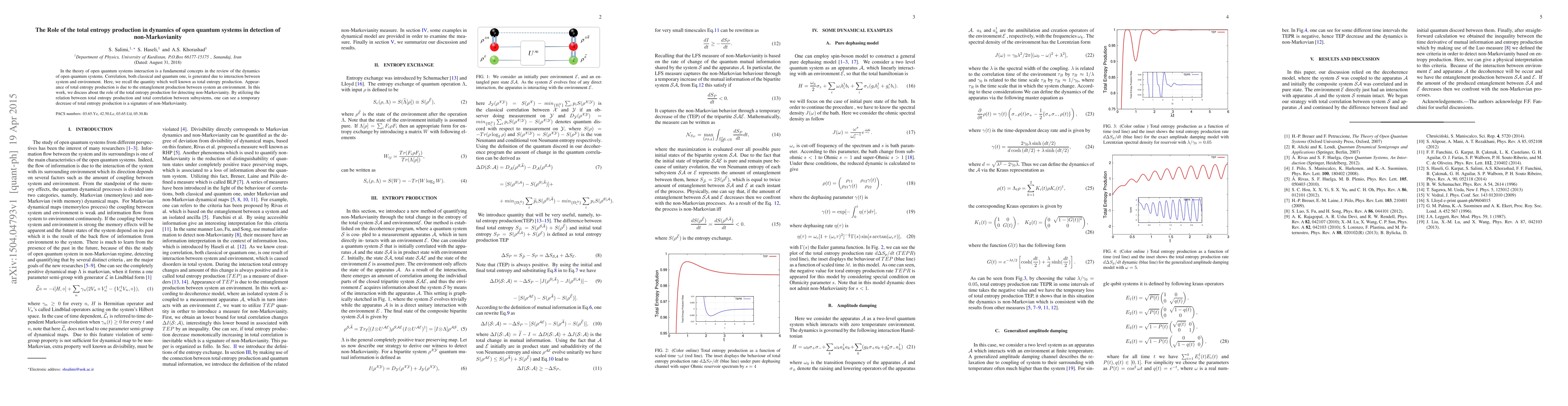 This paper explores the role of total entropy production in identifying non-Markovianity in open quantum systems. It highlights that temporary decreases in total entropy production, linked to the total correlation between subsystems, serve as a signature of non-Markovianity.