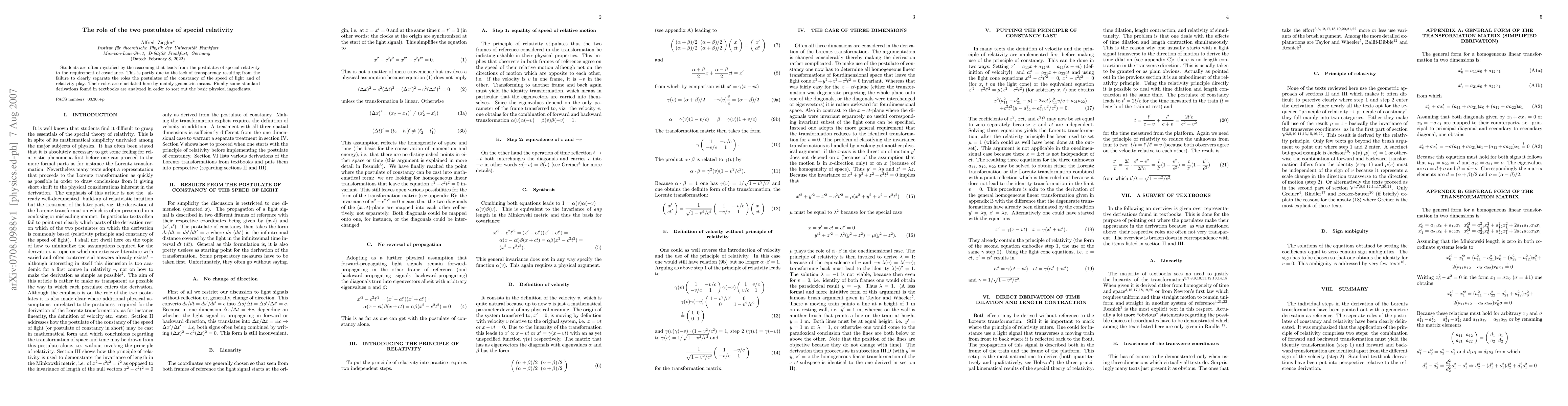 Students are often mystified by the reasoning that leads from the postulates of special relativity to the requirement of covariance. This is partly due to the lack of transparency resulting from the failure to clearly separate the roles the postulates of the constancy of the speed of light and of relativity play. Their roles are elucidated here by mainly geometric means. Finally some standard derivations found in textbooks are analyzed in order to sort out the basic physical ingredients.