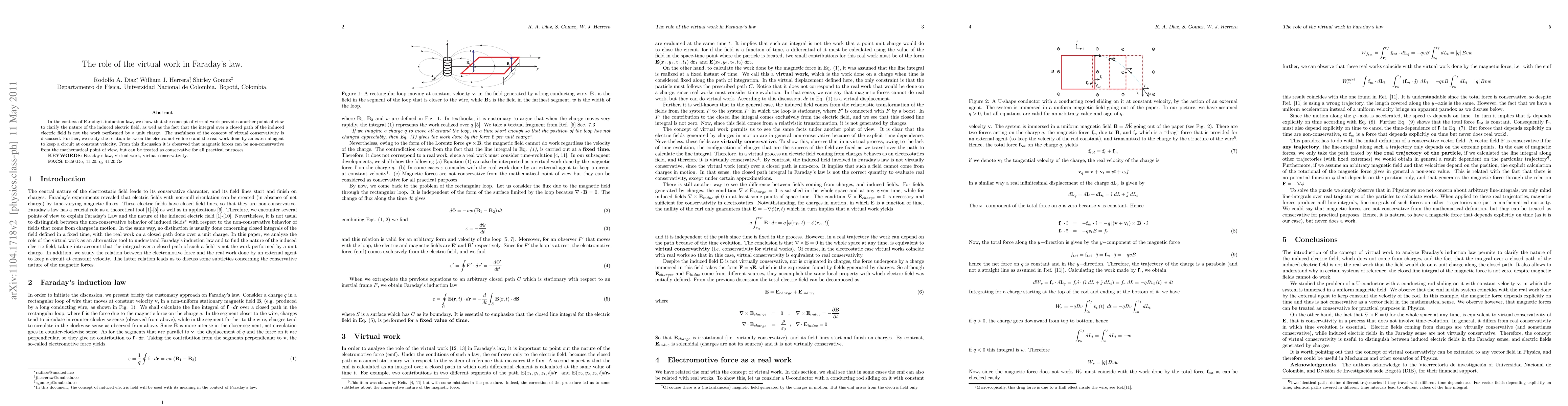 In the context of Faraday's induction law, we show that the concept of virtual work provides another point of view to clarify the nature of the induced electric field, as well as the fact that the integral over a closed path of the induced electric field is not the work performed by a unit charge. The usefulness of the concept of virtual conservativity is discussed. Further, we study the relation between the electromotive force and the real work done by an external agent to keep a circuit at constant velocity. From this discussion it is observed that magnetic forces can be non-conservative from the mathematical point of view, but can be treated as conservative for all practical purposes.