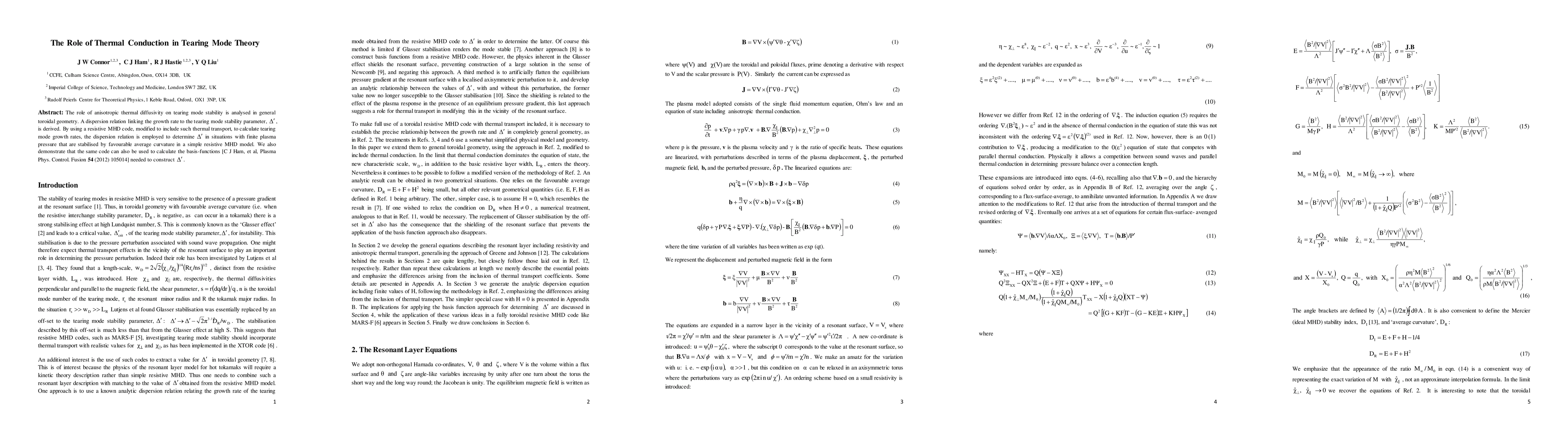 This paper investigates the impact of anisotropic thermal diffusivity on the stability of tearing modes in toroidal geometry, deriving a dispersion relation that links growth rate to the stability parameter Delta. Using a modified resistive MHD code, the authors demonstrate how favourable average curvature can stabilize tearing modes in finite plasma pressure scenarios.