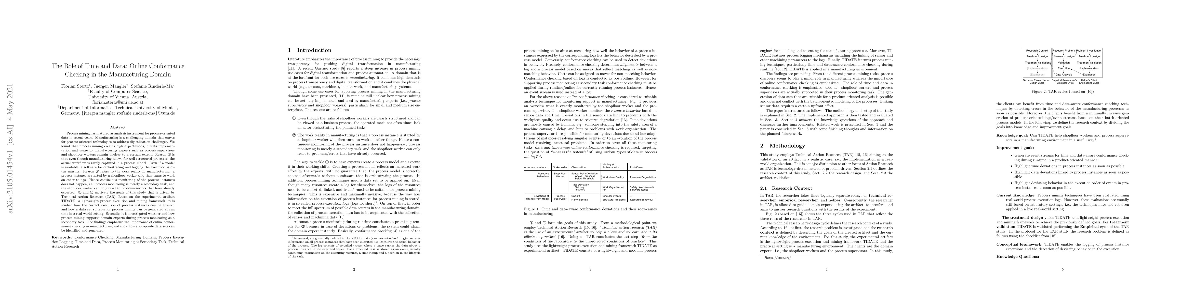 Process mining has matured as analysis instrument for process-oriented data in recent years. Manufacturing is a challenging domain that craves for process-oriented technologies to address digitalization challenges. We found that process mining creates high expectations, but its implementation and usage by manufacturing experts such as process supervisors and shopfloor workers remain unclear to a certain extent. Reason (1) is that even though manufacturing allows for well-structured processes, the actual workflow is rarely captured in a process model. Even if a model is available, a software for orchestrating and logging the execution is often missing. Reason (2) refers to the work reality in manufacturing: a process instance is started by a shopfloor worker who then turns to work on other things. Hence continuous monitoring of the process instances does not happen, i.e., process monitoring is merely a secondary task, and the shopfloor worker can only react to problems/errors that have already occurred. (1) and (2) motivate the goals of this study that is driven by Technical Action Research (TAR). Based on the experimental artifact TIDATE -- a lightweight process execution and mining framework -- it is studied how the correct execution of process instances can be ensured and how a data set suitable for process mining can be generated at run time in a real-world setting. Secondly, it is investigated whether and how process mining supports domain experts during process monitoring as a secondary task. The findings emphasize the importance of online conformance checking in manufacturing and show how appropriate data sets can be identified and generated.