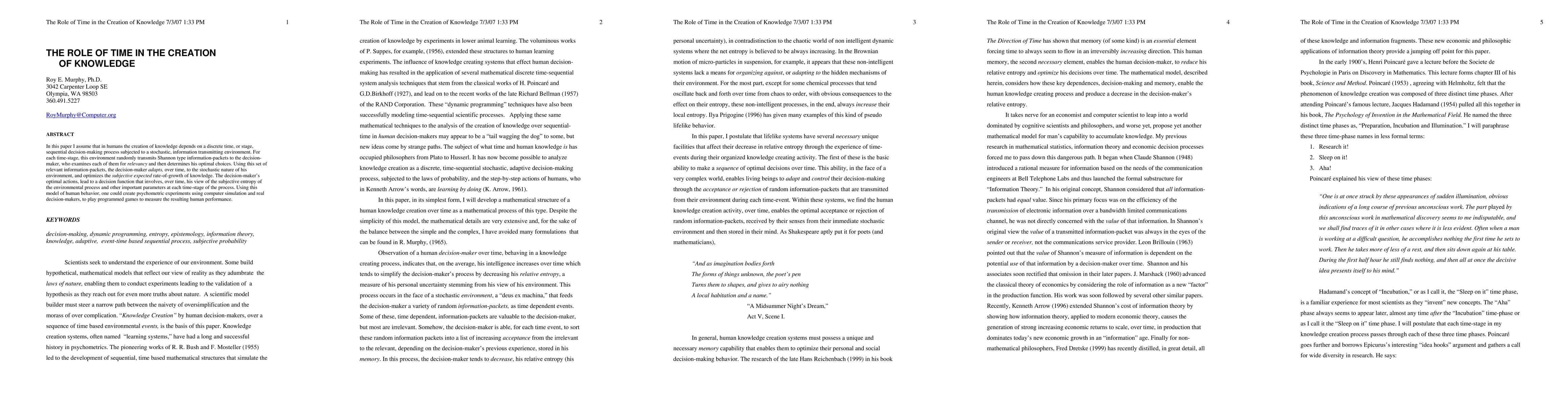 This paper proposes a model where human knowledge creation is a sequential, time-dependent process influenced by stochastic information packets. The decision-maker optimizes knowledge growth by adapting to environmental changes over time, using a decision function that considers subjective entropy and other parameters. The model can be applied in psychometric experiments via computer simulations and real-decision-maker games to assess human performance.
