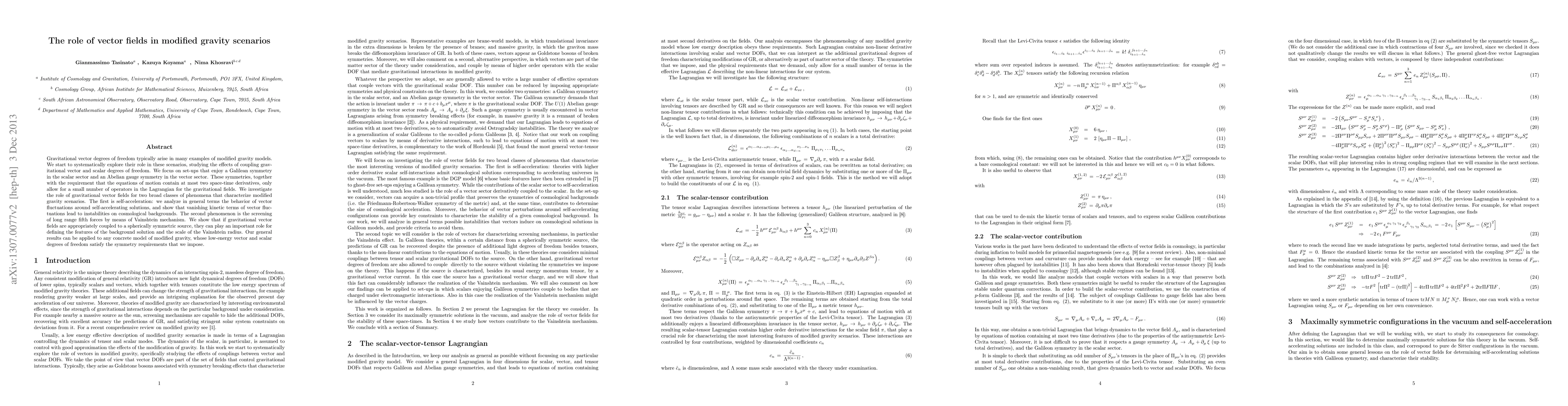 Research explores the role of vector fields in modified gravity scenarios, finding they can cause instabilities on cosmological backgrounds and influence the screening of long-range fifth forces.