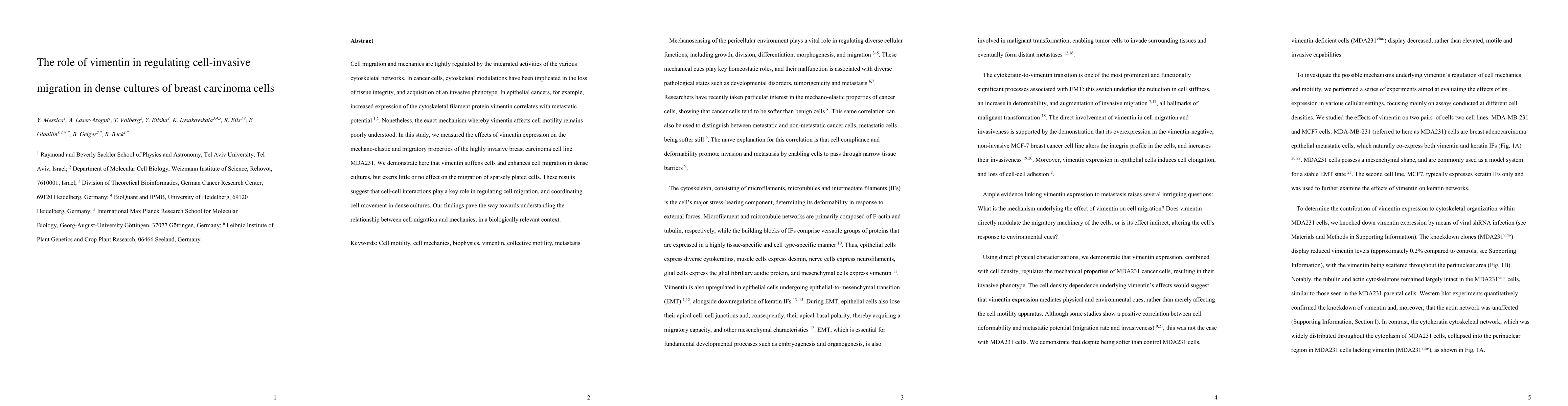 This study investigates the role of vimentin in cell-invasive migration in dense cultures of breast carcinoma cells, finding that vimentin enhances cell migration and stiffness in dense cultures but has little effect in sparse cultures, indicating the importance of cell-cell interactions in regulating migration.