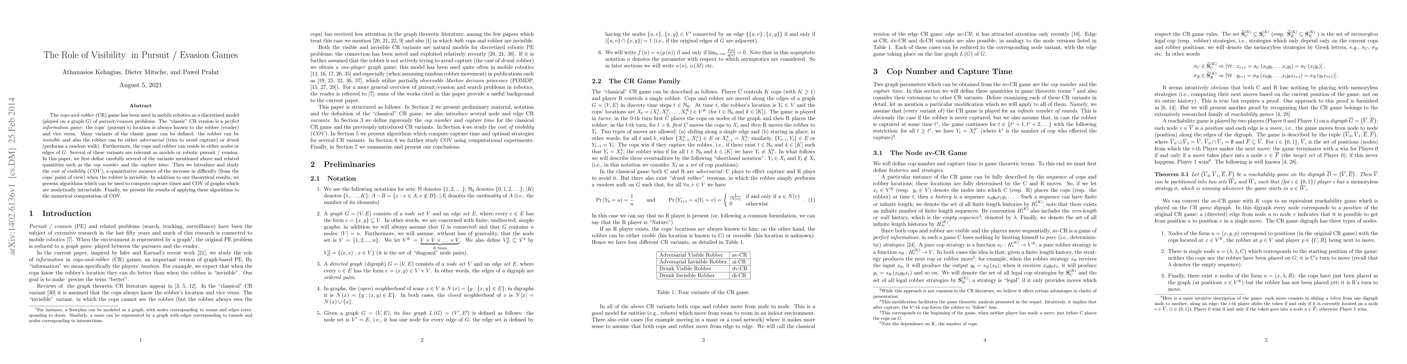 The cops-and-robber (CR) game has been used in mobile robotics as a discretized model (played on a graph G) of pursuit/evasion problems. The "classic" CR version is a perfect information game: the cops' (pursuer's) location is always known to the robber (evader) and vice versa. Many variants of the classic game can be defined: the robber can be invisible and also the robber can be either adversarial (tries to avoid capture) or drunk (performs a random walk). Furthermore, the cops and robber can reside in either nodes or edges of G. Several of these variants are relevant as models or robotic pursuit / evasion. In this paper, we first define carefully several of the variants mentioned above and related quantities such as the cop number and the capture time. Then we introduce and study the cost of visibility (COV), a quantitative measure of the increase in difficulty (from the cops' point of view) when the robber is invisible. In addition to our theoretical results, we present algorithms which can be used to compute capture times and COV of graphs which are analytically intractable. Finally, we present the results of applying these algorithms to the numerical computation of COV.