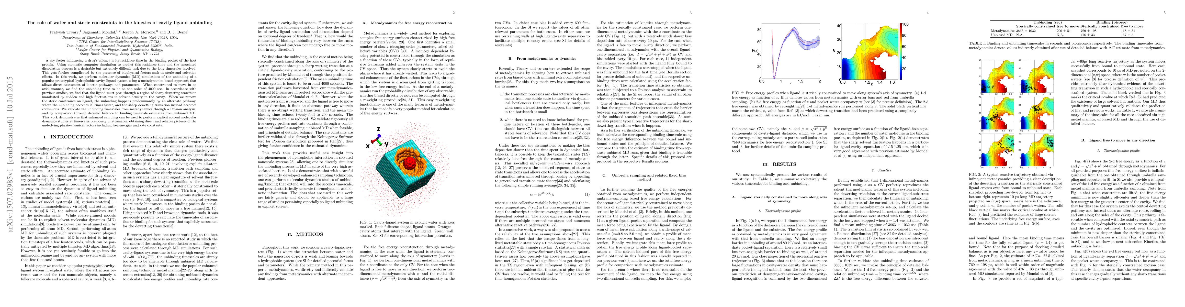 This study uses metadynamics simulations to explore the kinetics of cavity-ligand unbinding, revealing that steric constraints significantly prolong the unbinding process, while removal of these constraints enables a much faster, alternate unbinding pathway. The research highlights the role of water and steric effects in determining drug residence times.