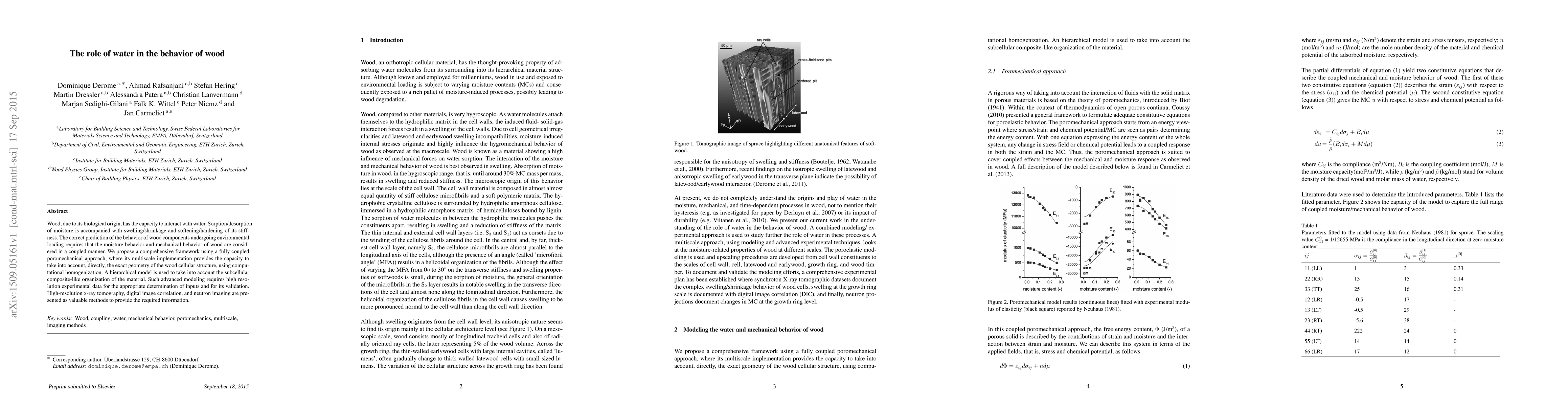 This paper proposes a comprehensive framework for predicting wood behavior under environmental loading, utilizing a fully coupled poromechanical approach that considers moisture and mechanical interactions. High-resolution experimental techniques, such as x-ray tomography and neutron imaging, are essential for validating the model and capturing the wood's cellular structure.
