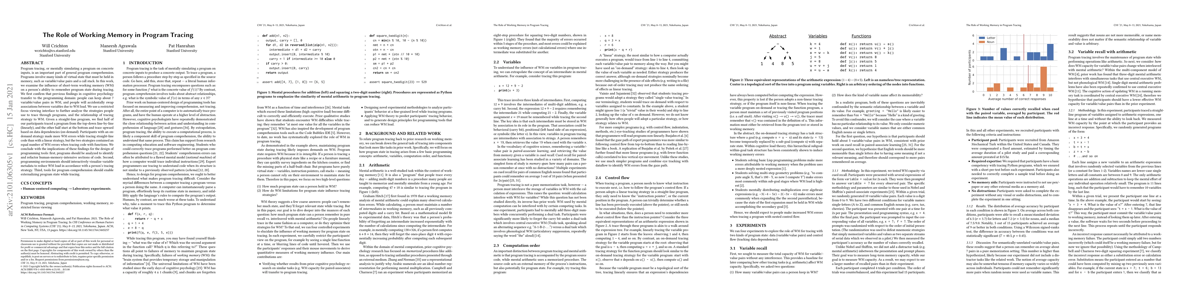 Program tracing, or mentally simulating a program on concrete inputs, is an important part of general program comprehension. Programs involve many kinds of virtual state that must be held in memory, such as variable/value pairs and a call stack. In this work, we examine the influence of short-term working memory (WM) on a person's ability to remember program state during tracing. We first confirm that previous findings in cognitive psychology transfer to the programming domain: people can keep about 7 variable/value pairs in WM, and people will accidentally swap associations between variables due to WM load. We use a restricted focus viewing interface to further analyze the strategies people use to trace through programs, and the relationship of tracing strategy to WM. Given a straight-line program, we find half of our participants traced a program from the top-down line-by-line (linearly), and the other half start at the bottom and trace upward based on data dependencies (on-demand). Participants with an on-demand strategy made more WM errors while tracing straight-line code than with a linear strategy, but the two strategies contained an equal number of WM errors when tracing code with functions. We conclude with the implications of these findings for the design of programming tools: first, programs should be analyzed to identify and refactor human-memory-intensive sections of code. Second, programming environments should interactively visualize variable metadata to reduce WM load in accordance with a person's tracing strategy. Third, tools for program comprehension should enable externalizing program state while tracing.
