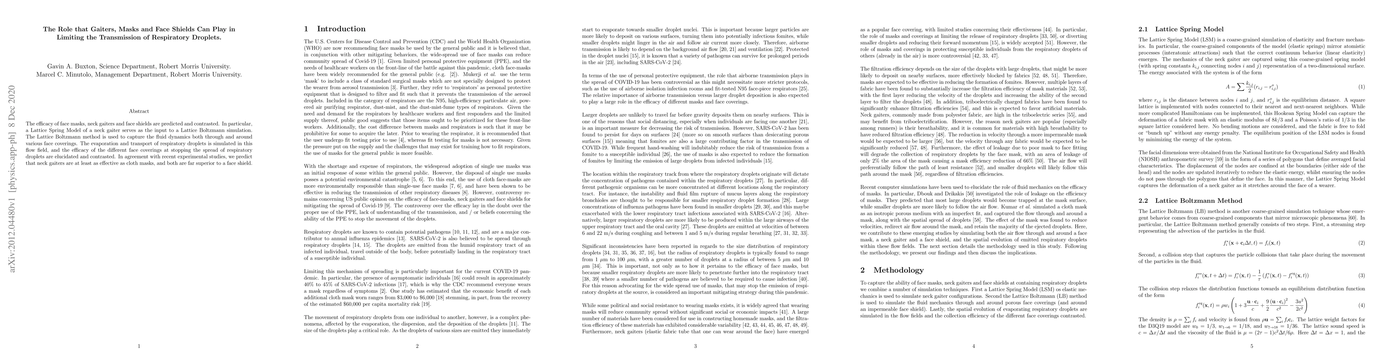 The efficacy of face masks, neck gaiters and face shields are predicted and contrasted. In particular, a Lattice Spring Model of a neck gaiter serves as the input to a Lattice Boltzmann simulation. The Lattice Boltzmann method is used to capture the fluid dynamics both through and around various face coverings. The evaporation and transport of respiratory droplets is simulated in this flow field, and the efficacy of the different face coverings at stopping the spread of respiratory droplets are elucidated and contrasted. In agreement with recent experimental studies, we predict that neck gaiters are at least as effective as cloth masks, and both are far superior to a face shield.