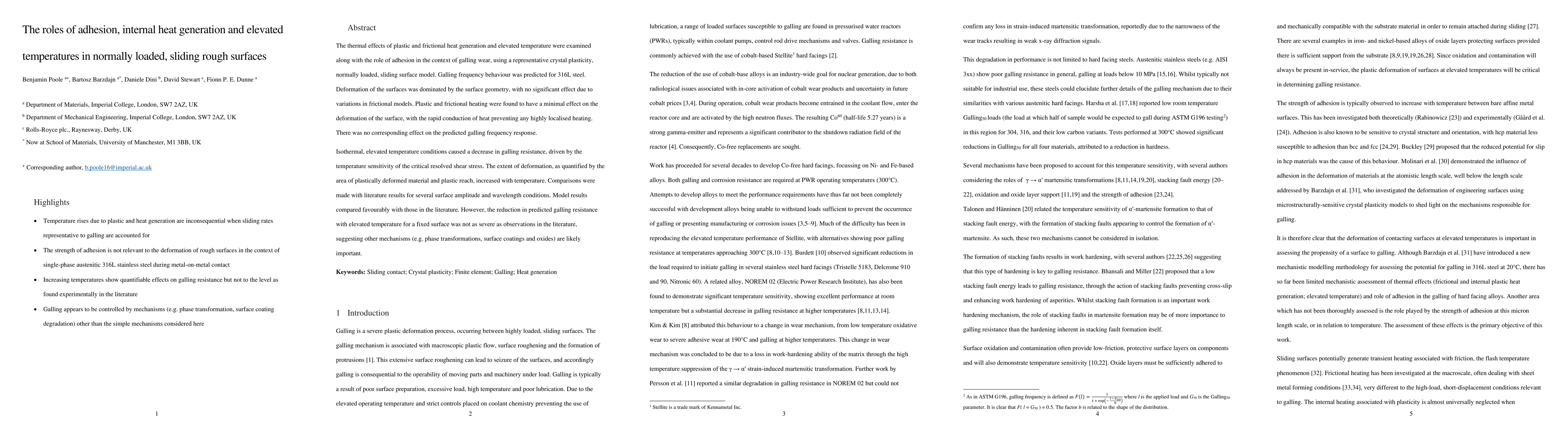 The thermal effects of plastic and frictional heat generation and elevated temperature were examined along with the role of adhesion in the context of galling wear, using a representative crystal plasticity, normally loaded, sliding surface model. Galling frequency behaviour was predicted for 316L steel. Deformation of the surfaces was dominated by the surface geometry, with no significant effect due to variations in frictional models. Plastic and frictional heating were found to have a minimal effect on the deformation of the surface, with the rapid conduction of heat preventing any highly localised heating. There was no corresponding effect on the predicted galling frequency response. Isothermal, elevated temperature conditions caused a decrease in galling resistance, driven by the temperature sensitivity of the critical resolved shear stress. The extent of deformation, as quantified by the area of plastically deformed material and plastic reach, increased with temperature. Comparisons were made with literature results for several surface amplitude and wavelength conditions. Model results compared favourably with those in the literature. However, the reduction in predicted galling resistance with elevated temperature for a fixed surface was not as severe as observations in the literature, suggesting other mechanisms (e.g. phase transformations, surface coatings and oxides) are likely important.