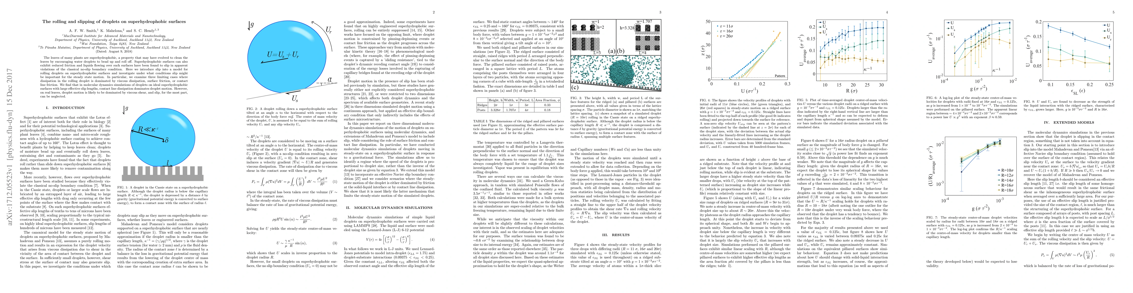 This paper investigates the dynamics of rolling and slipping water droplets on superhydrophobic surfaces, exploring conditions under which slip occurs. It finds that while slip is significant in ideal simulations, real-world leaves exhibit droplet motion dominated by viscous shear, making slip negligible.