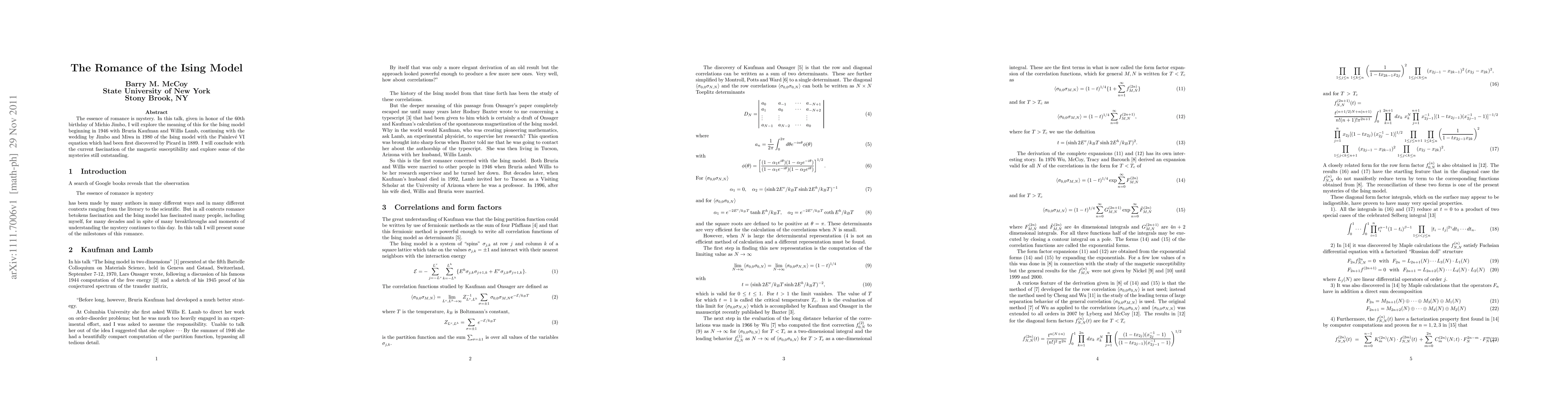 This paper explores the connection between the Ising model, a mathematical concept in physics, and romance, tracing its development from 1946 to the current fascination with magnetic susceptibility, highlighting ongoing mysteries.
