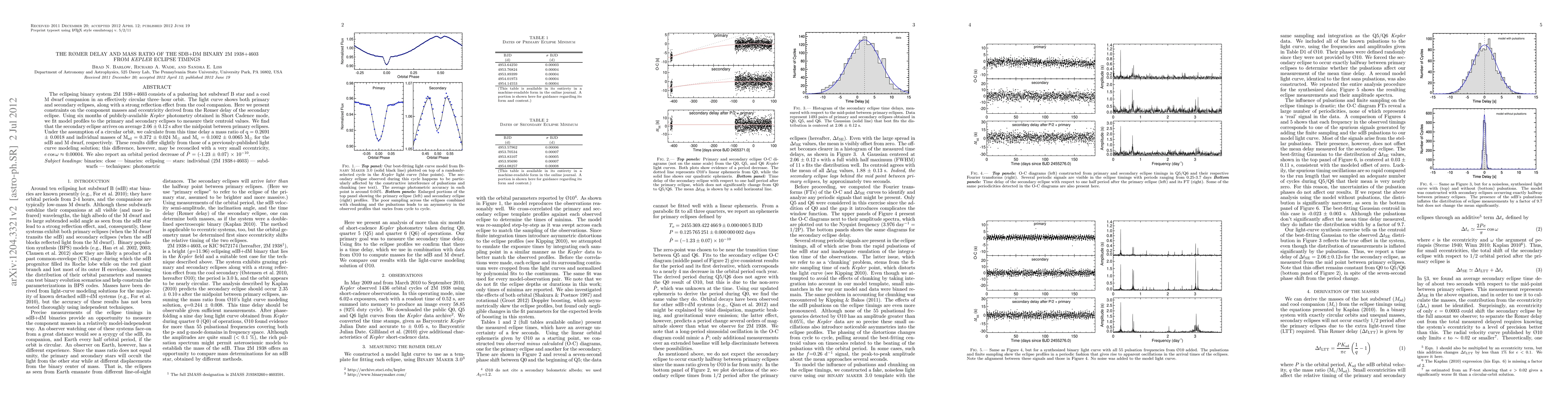 This paper analyzes the eclipsing binary 2M 1938+4603 using Kepler photometry to determine the mass ratio and individual masses of its components, finding a mass ratio of q = 0.2691 +/- 0.0018 and masses of M_sd = 0.372 +/- 0.024 Msun and M_c = 0.1002 +/- 0.0065 Msun for the sdB and M dwarf, respectively.