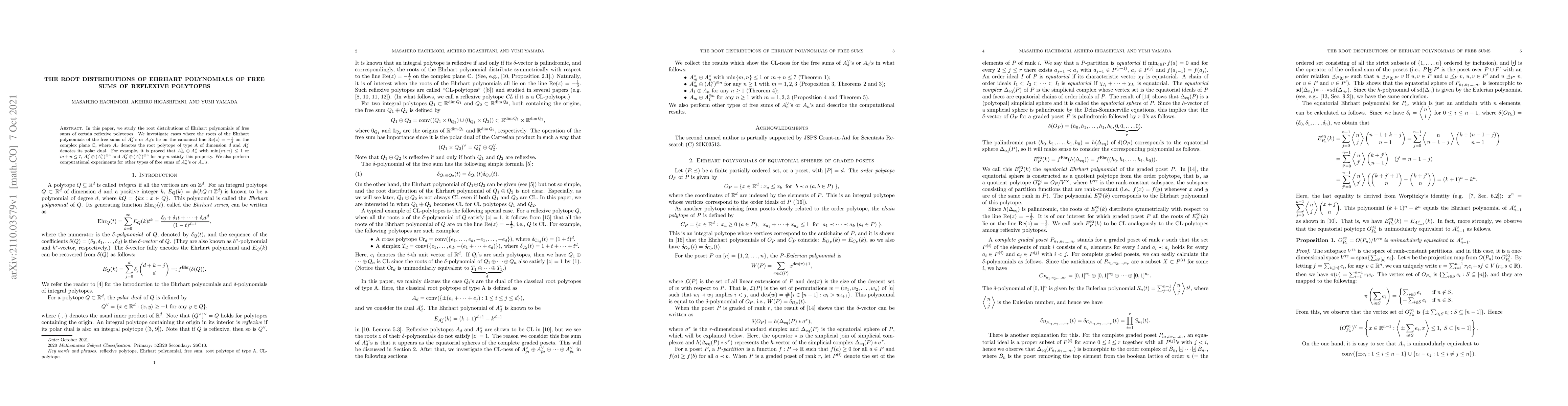 This paper examines the root distributions of Ehrhart polynomials for free sums of reflexive polytopes, specifically identifying cases where roots lie on the canonical line in the complex plane. It proves that certain combinations of $A_d^\vee$ and $A_d$ polytopes exhibit roots on the line $\mathrm{Re}(z)=-\frac{1}{2}$.