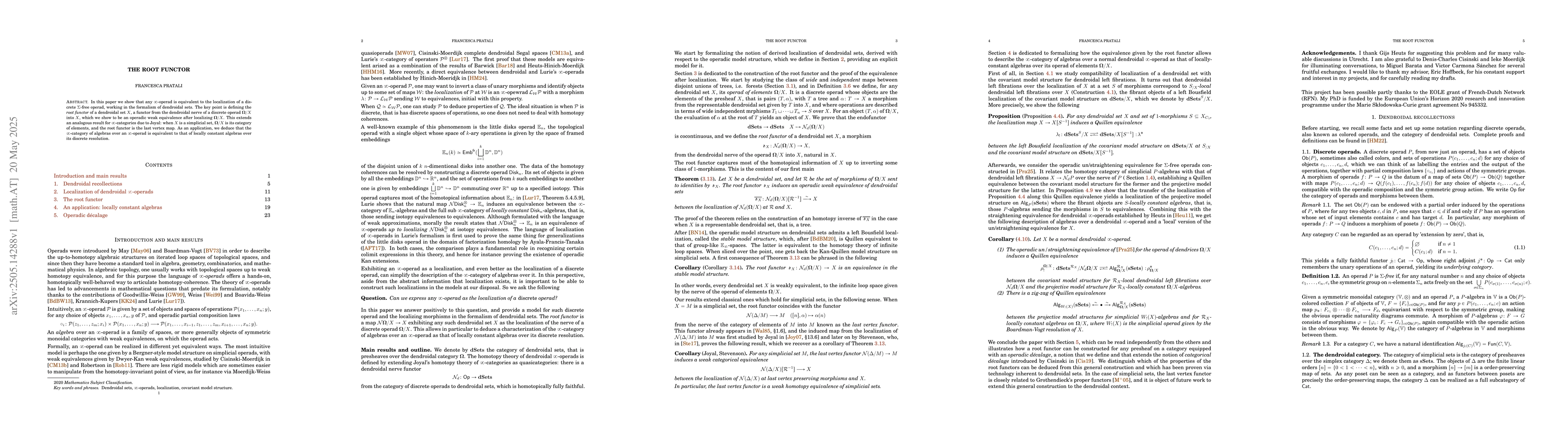 The definition and properties of the root functor, along with the proof of its operadic weak equivalence after localization, constitute the main technical contribution.