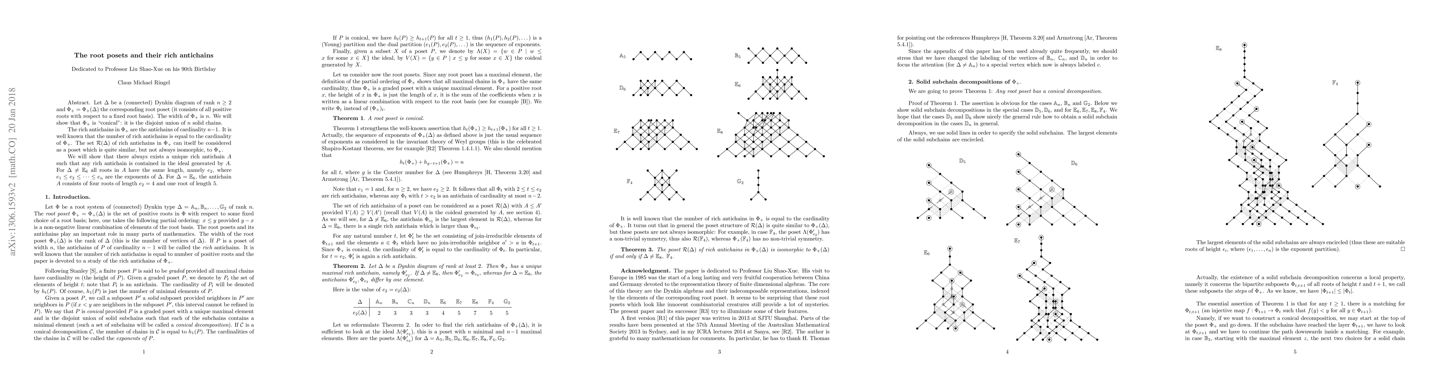 Let $\Delta$ be a (connected) Dynkin diagram of rank $n\ge 2$ and $\Phi_+ = \Phi_+(\Delta)$ the corresponding root poset (it consists of all positive roots with respect to a fixed root basis). The width of $\Phi_+$ is $n$. We will show that $\Phi_+$ is "conical": it is the disjoint union of $n$ solid chains. The rich antichains in $\Phi_+$ are the antichains of cardinality $n-1$. It is well known that the number of rich antichains is equal to the cardinality of $\Phi_+$. The set $\mathcal R(\Delta)$ of rich antichains in $\Phi_+$ can itself be considered as a poset which is quite similar, but not always isomorphic, to $\Phi_+$. We will show that there always exists a unique rich antichain $A$ such that any rich antichain is contained in the ideal generated by $A$. For $\Delta\neq \Bbb E_6$ all roots in $A$ have the same length, namely $e_2$, where $e_1 \le e_2 \le \dots \le e_n$ are the exponents of $\Delta.$ For $\Delta = \Bbb E_6$, the antichain $A$ consists of four roots of length $e_2 = 4$ and one root of length $5$.