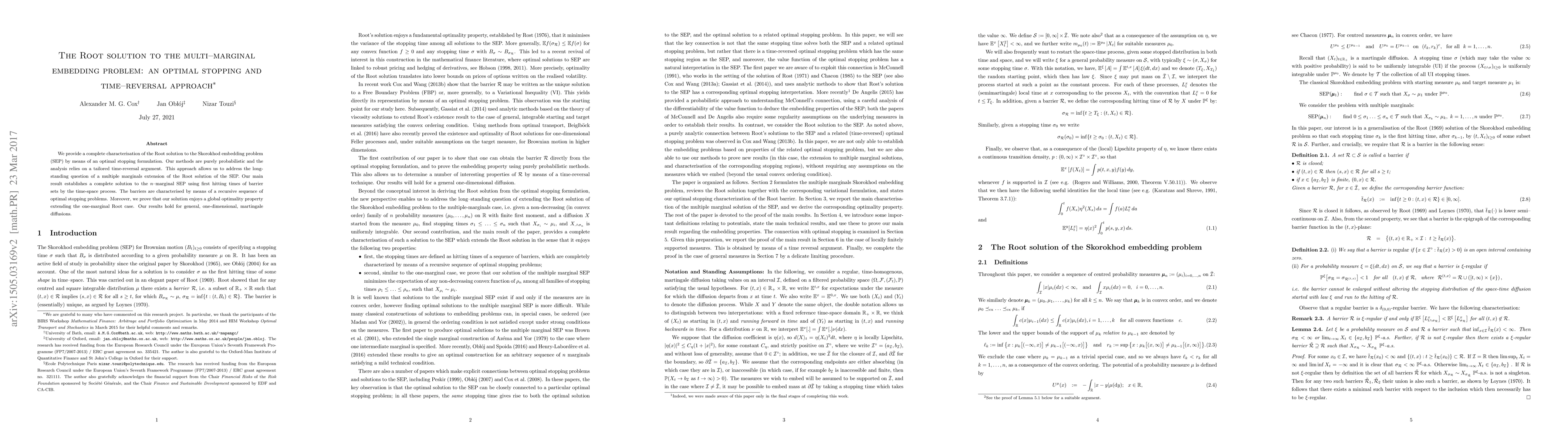 This paper provides a complete characterization of the Root solution to the multi-marginal Skorokhod embedding problem using optimal stopping and time-reversal techniques. It establishes a global optimality solution for n-marginal embedding problems through first hitting times of barrier sets.