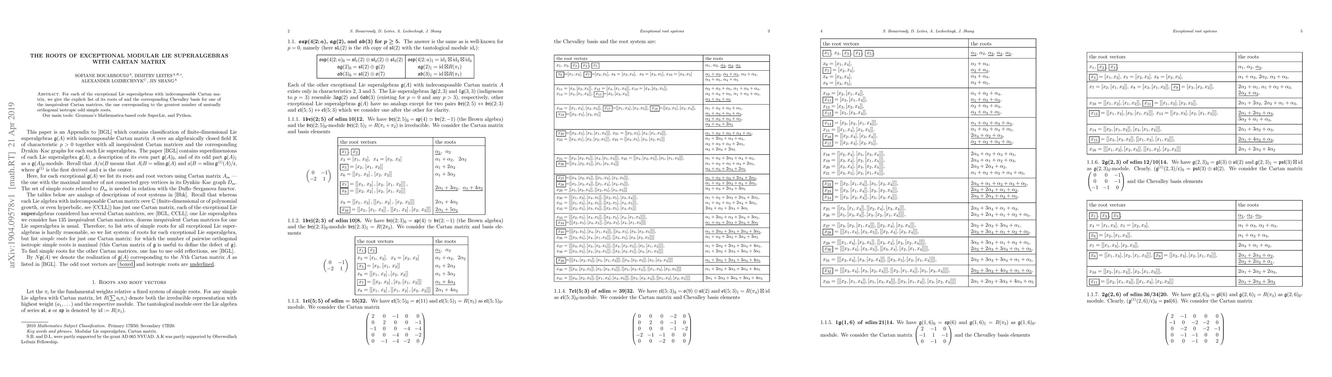 This paper provides an explicit list of roots and a Chevalley basis for each exceptional indecomposable modular Lie superalgebra, focusing on the Cartan matrix with the greatest number of mutually orthogonal isotropic odd simple roots. The study utilizes Grozman's Mathematica-based code SuperLie and Python for computational analysis.