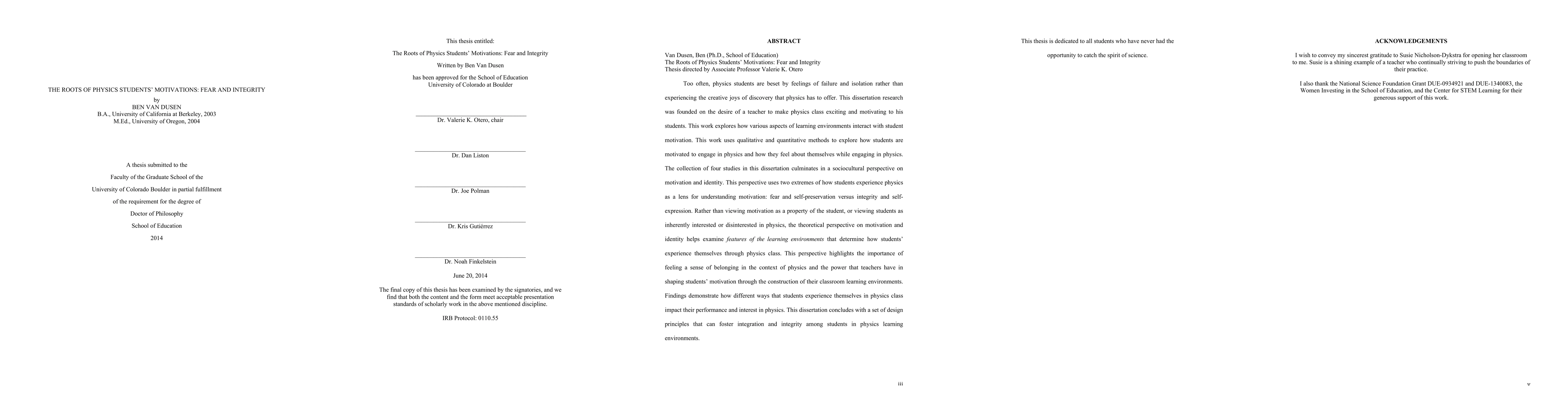 Too often, physics students are beset by feelings of failure and isolation rather than experiencing the creative joys of discovery that physics has to offer. This dissertation research was founded on the desire of a teacher to make physics class exciting and motivating to his students. This work explores how various aspects of learning environments interact with student motivation. This work uses qualitative and quantitative methods to explore how students are motivated to engage in physics and how they feel about themselves while engaging in physics. The collection of four studies in this dissertation culminates in a sociocultural perspective on motivation and identity. This perspective uses two extremes of how students experience physics as a lens for understanding motivation: fear and self-preservation versus integrity and self-expression. Rather than viewing motivation as a property of the student, or viewing students as inherently interested or disinterested in physics, the theoretical perspective on motivation and identity helps examine features of the learning environments that determine how students experience themselves through physics class. This perspective highlights the importance of feeling a sense of belonging in the context of physics and the power that teachers have in shaping student motivations through the construction of their classroom learning environments. Findings demonstrate how different ways that students experience themselves in physics class impact their performance and interest in physics. This dissertation concludes with a set of design principles that can foster integration and integrity among students in physics learning environments.