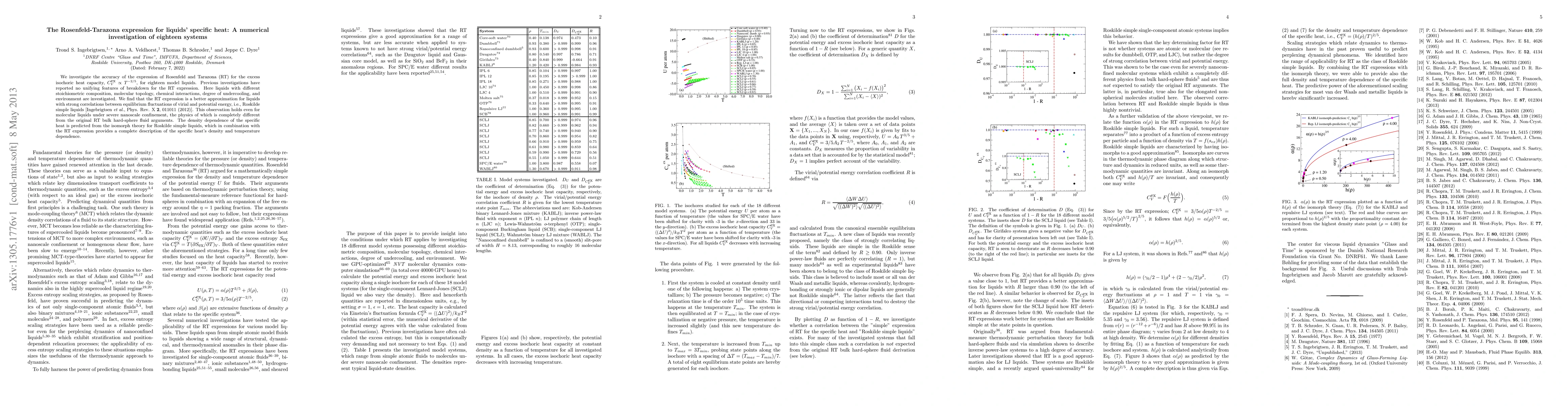 We investigate the accuracy of the expression of Rosenfeld and Tarazona (RT) for the excess isochoric heat capacity, C_V^{ex} \propto T^{-2/5}, for eighteen model liquids. Previous investigations have reported no unifying features of breakdown for the RT expression. Here liquids with different stoichiometric composition, molecular topology, chemical interactions, degree of undercooling, and environment are investigated. We find that the RT expression is a better approximation for liquids with strong correlations between equilibrium fluctuations of virial and potential energy, i.e., Roskilde simple liquids [Ingebrigtsen et al., Phys. Rev. X 2, 011011 (2012)]. This observation holds even for molecular liquids under severe nanoscale confinement, the physics of which is completely different from the original RT bulk hard-sphere fluid arguments. The density dependence of the specific heat is predicted from the isomorph theory for Roskilde simple liquids, which in combination with the RT expression provides a complete description of the specific heat's density and temperature dependence.