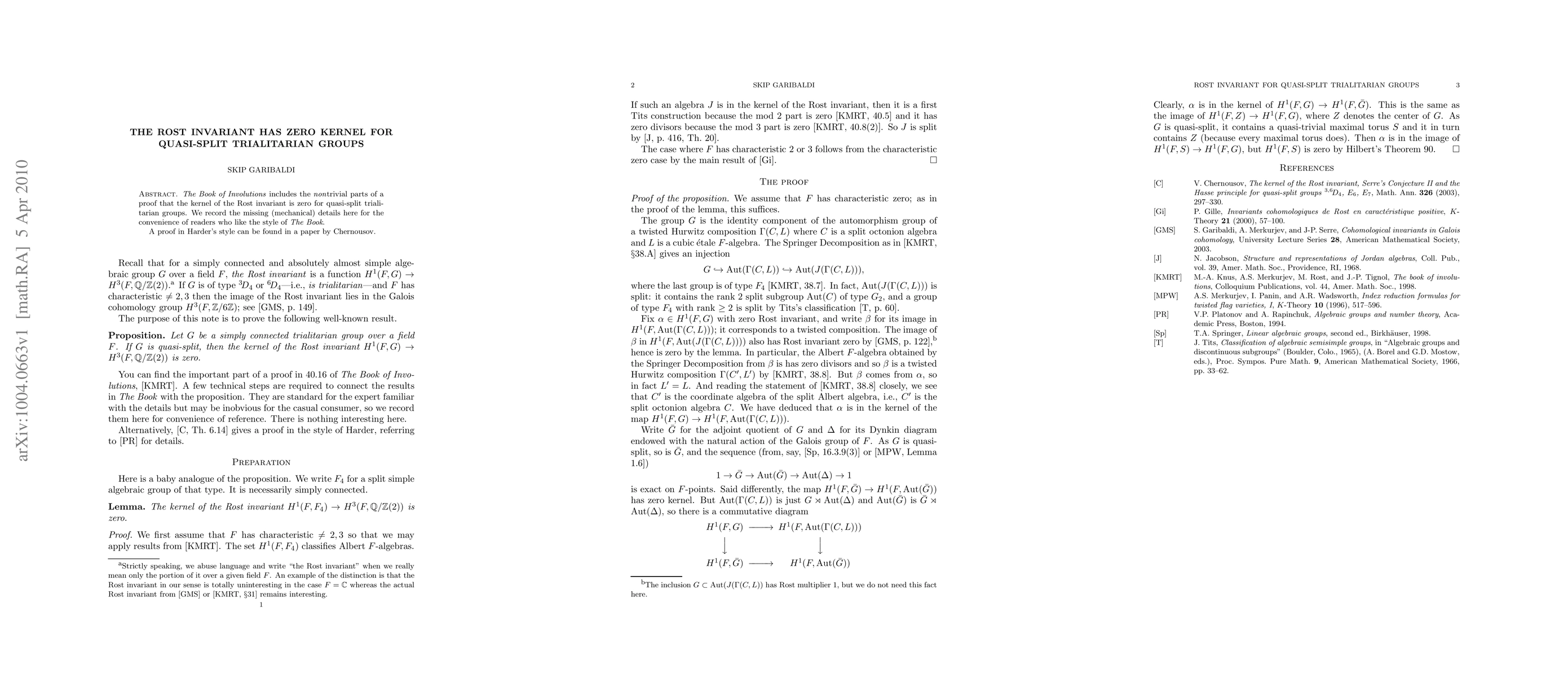 This paper proves that the Rost invariant has a zero kernel for quasi-split trialitarian groups, a result previously noted but not fully detailed in a book.