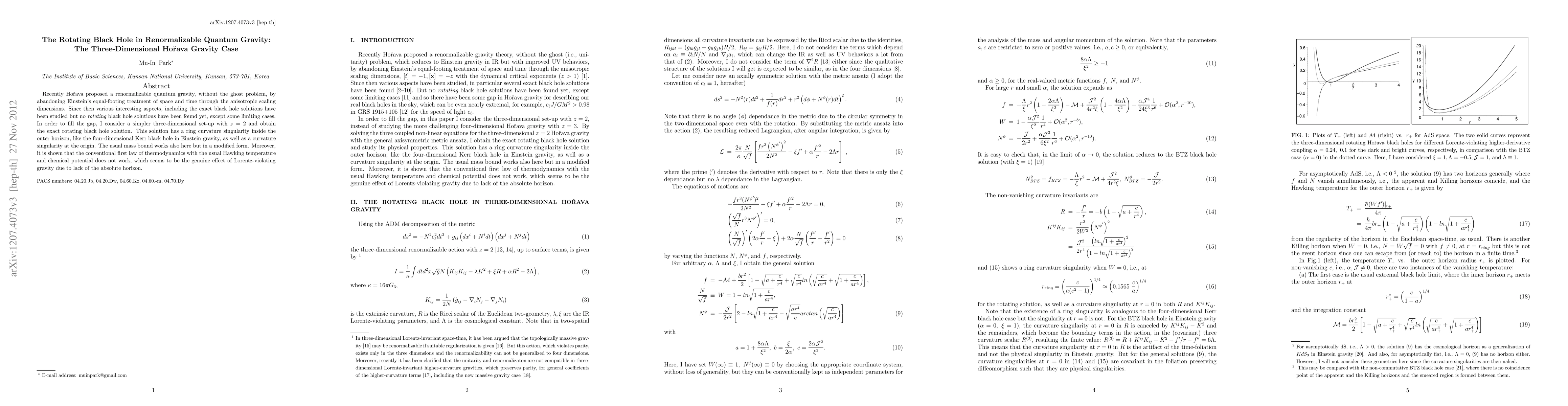 Researchers found a rotating black hole solution in three-dimensional Hoárava gravity, with ring curvature singularity inside the outer horizon and modified mass bound. The conventional first law of thermodynamics does not apply due to Lorentz-violating gravity.